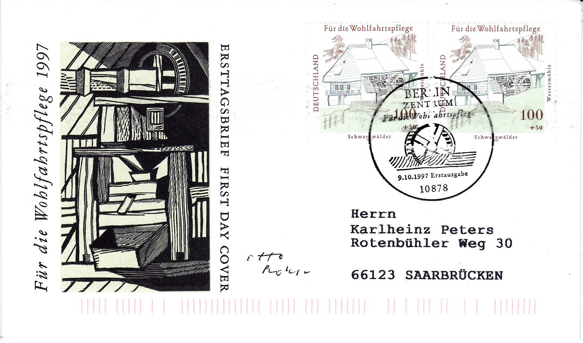 Dieser Brief vom Ersttag mit dem Ersttagsonderstempel ist mit dieser Wassermühle frankiert.