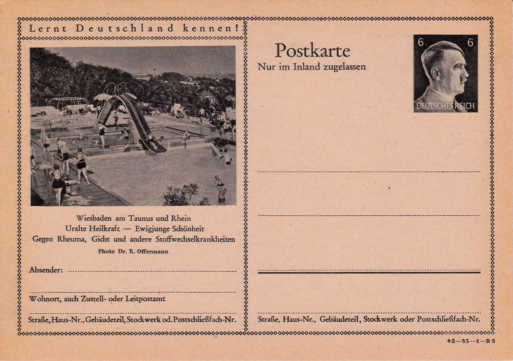 Auf dieser Karten (Serie 33 Bild 4) zeigt Wiesbaden ein Schwimmbad.
