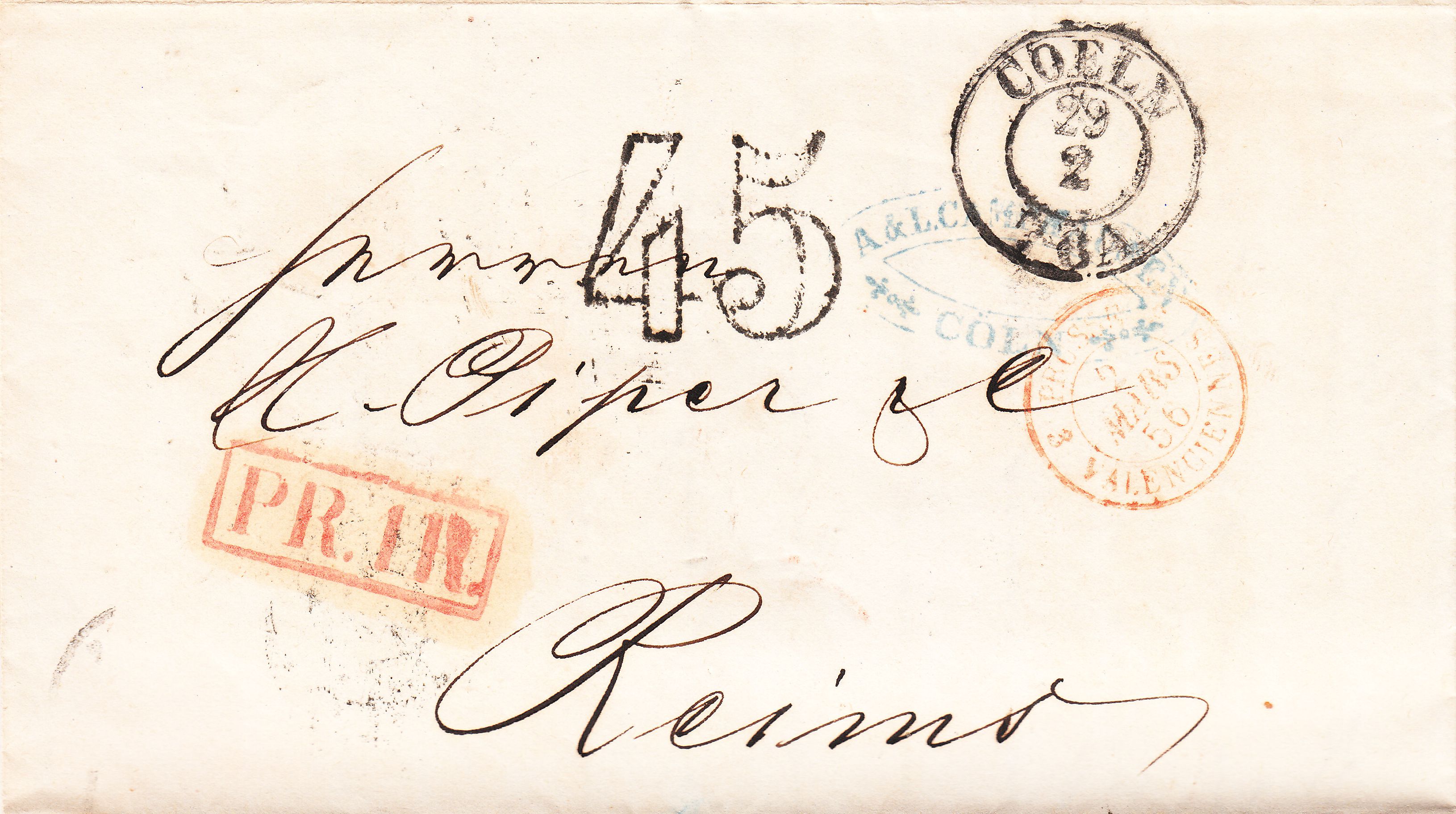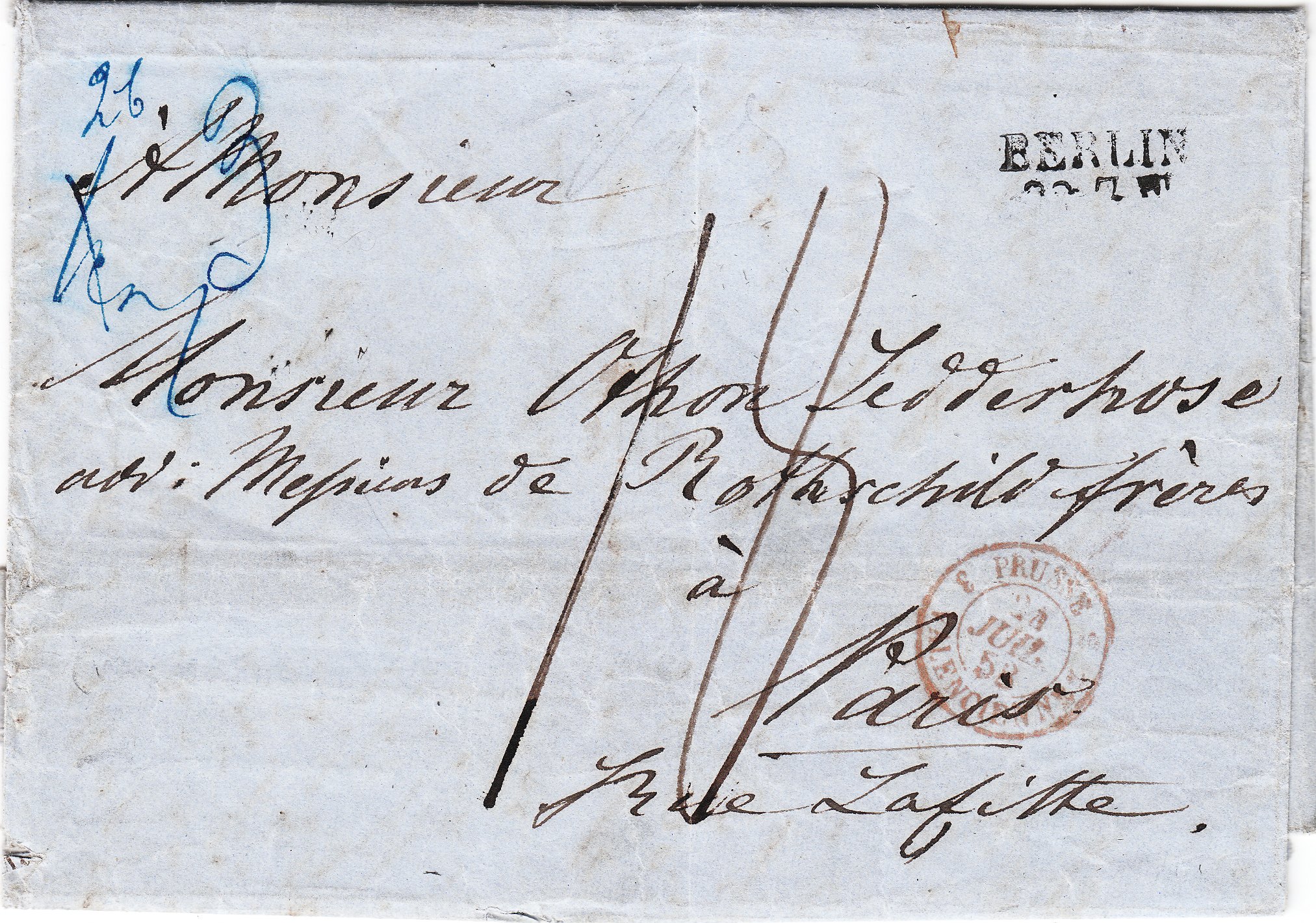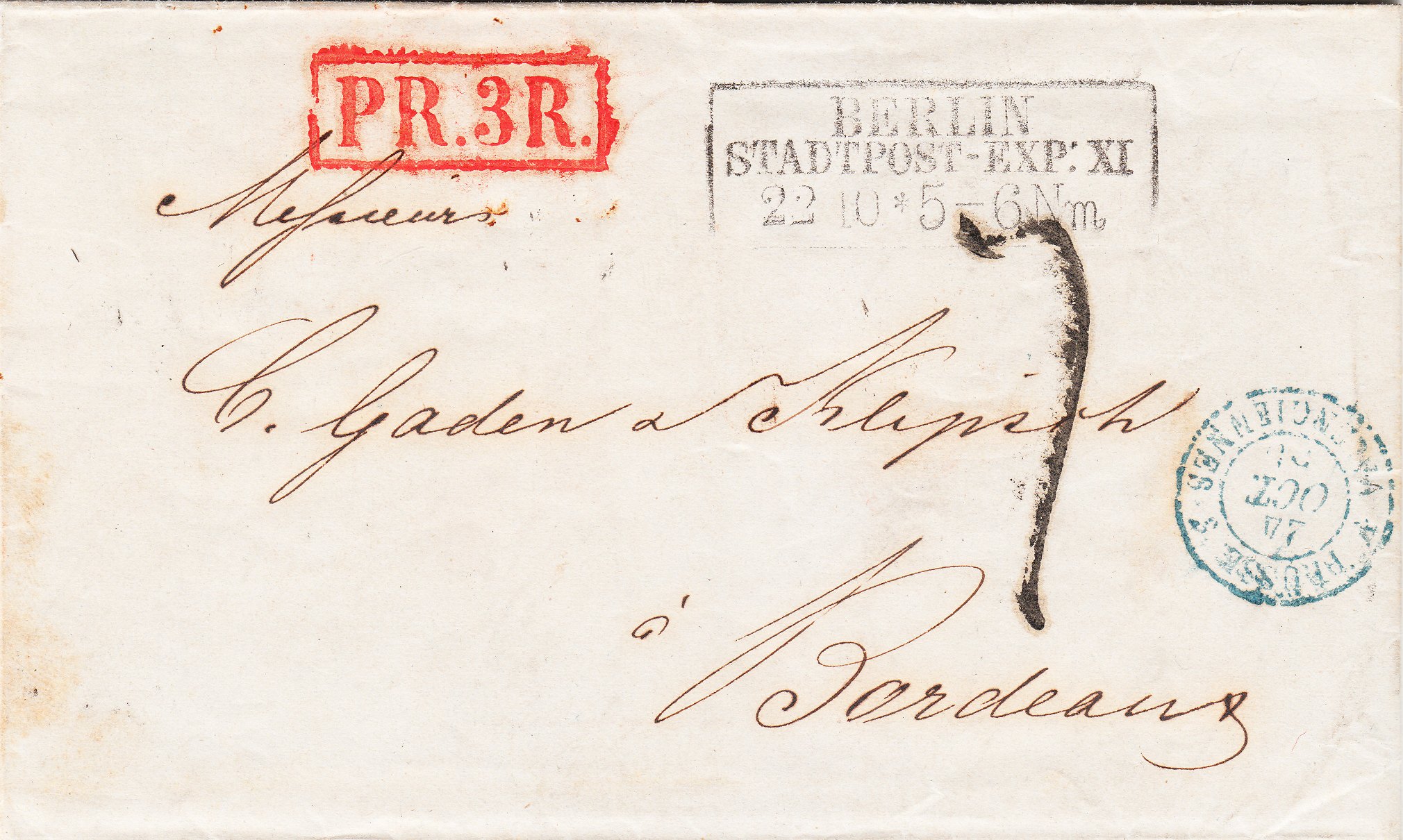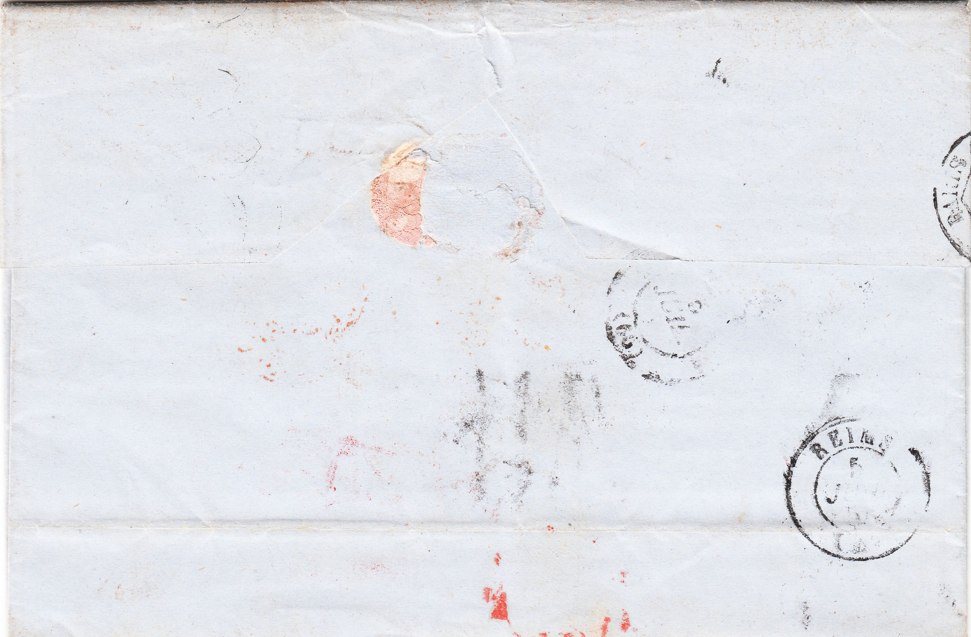 Der französische Anteil der Gebühr betrug 25 Centimes für einen Brief bis 7,5 Gramm plus 5 Centimes für den Transit durch Belgien. Es wurde eine Gewichtsprogression angewendet. Um auf die Gesamtsumme von 18 Decimen = 180 Centimes zu kommen muß man die 30 Centimes mal 3,5 nehmen, was einem Gewicht von 26 bis 30 Gramm entsprechen sollte, und der französische Gebührenanteil errechnet sich zu 105 Centimes.