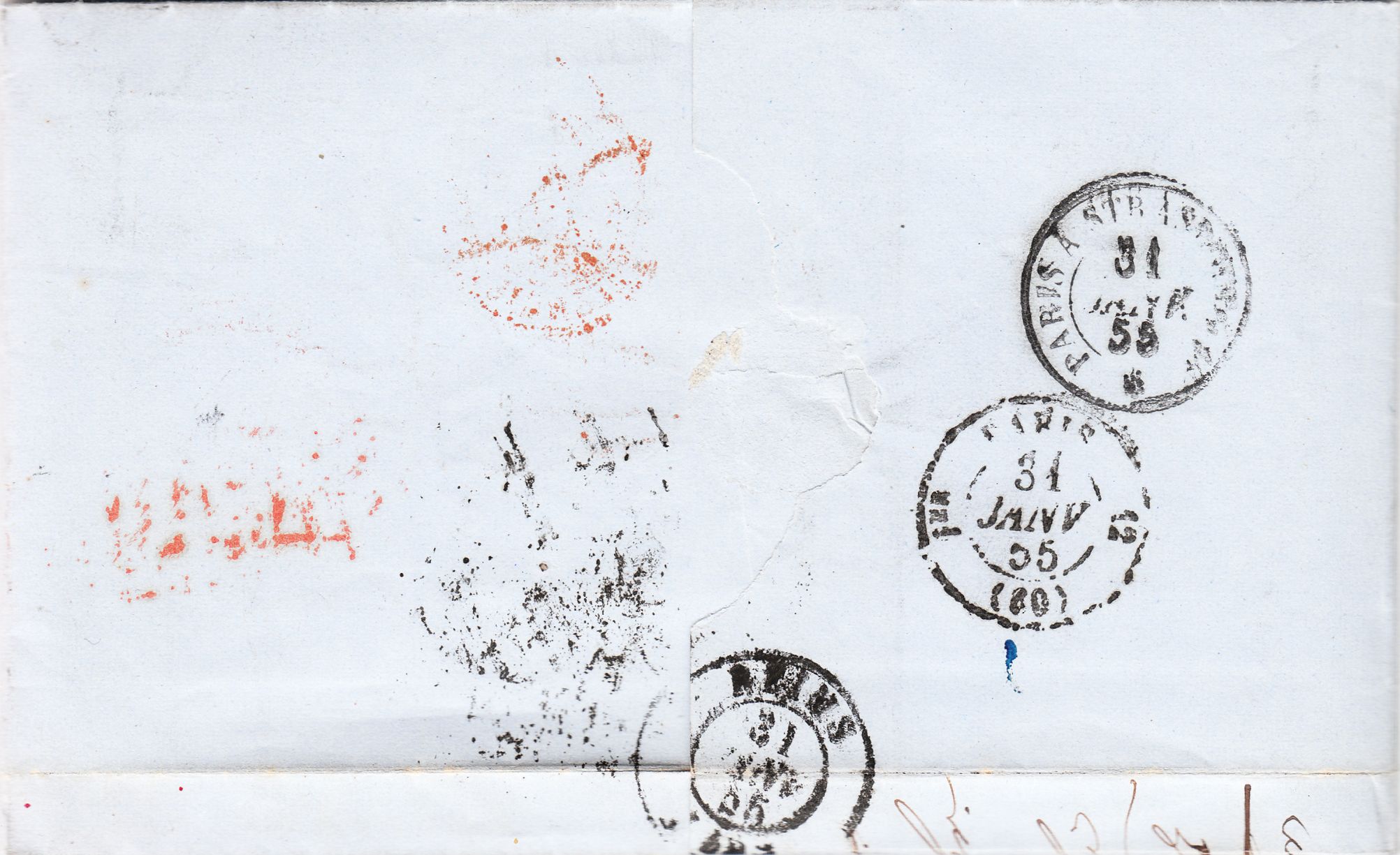 Am 24.07.1858 lief der Beleg durch das Grenzpostamt Valenciennes, was ein Zweikreisstempel in Rot mit der Kennziffer "3"dokumentiert.