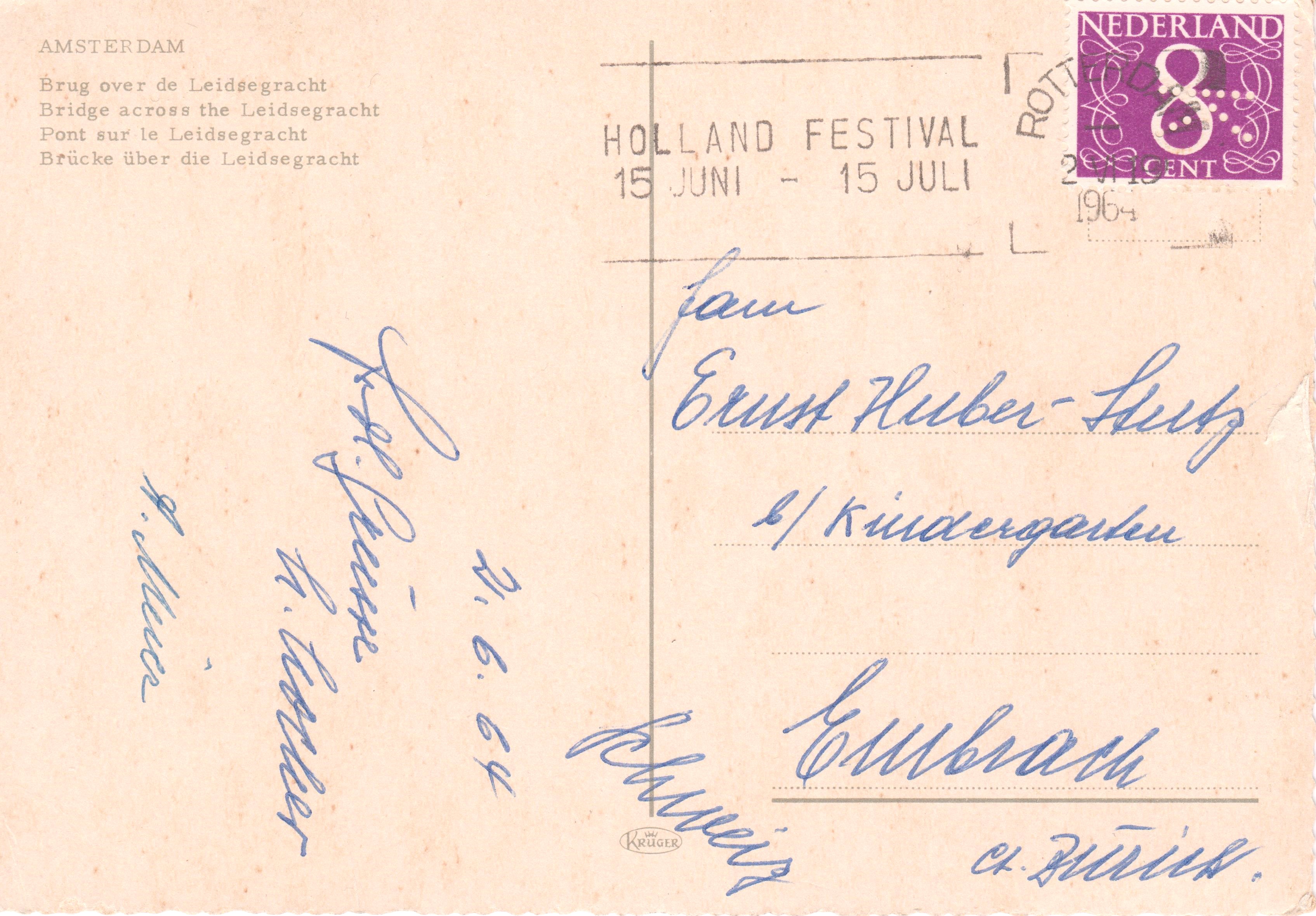 In die Schweiz adressiere Postkarte, frankiert mit einem Postwertzeichen mit Firmenlochung "K" aufgegeben am 02.06.1964 in ROTTERDAM: