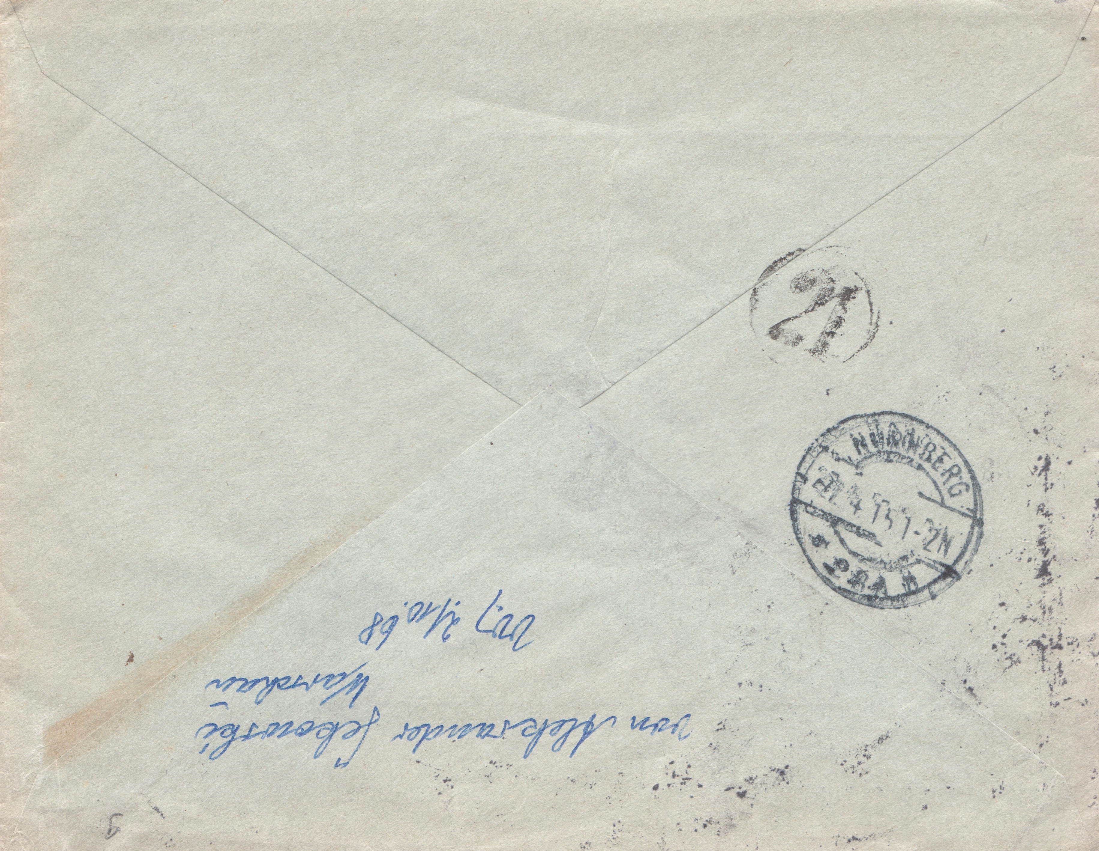 Rückseitig Zustellerstempel "21" aus Nürnberg: