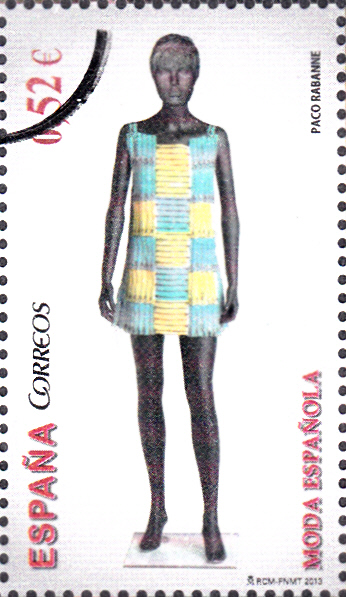 Diese Marke aus Spanien (MiNr 4806) zeigt ein Langes Kleid mit versilberten Kunststoffplättchen, eine Kreation von Paco Rabanne. Das hier gezeigte Exemplar ist ein Mustermarke.