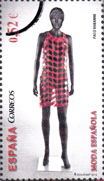 Diese Marke aus Spanien (MiNr 4806) zeigt ein Langes Kleid mit versilberten Kunststoffplättchen, eine Kreation von Paco Rabanne. Das hier gezeigte Exemplar ist ein Mustermarke.