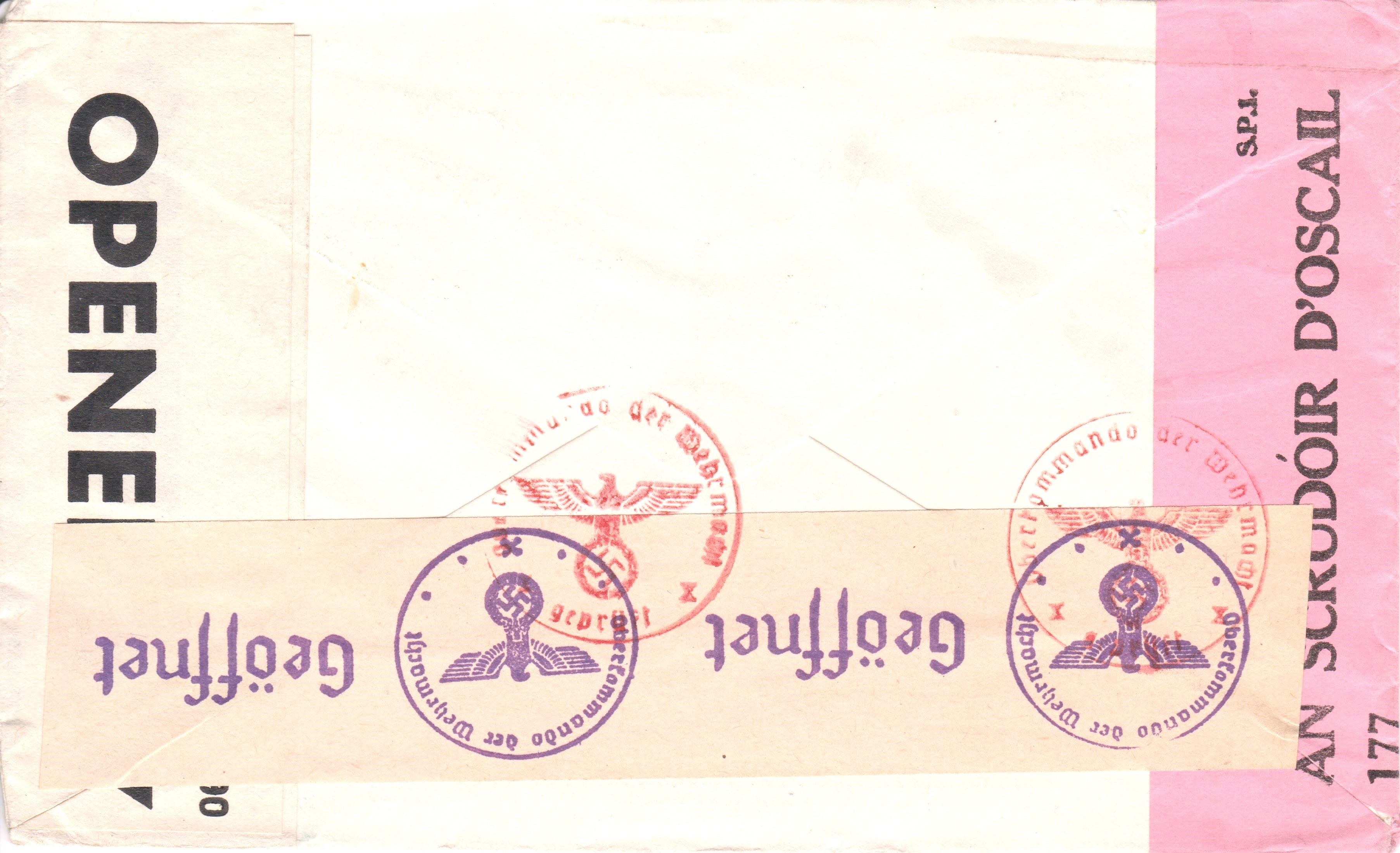 Dieser am 20.04.1944 in DUBLIN (= Irland) aufgegebene, nach "Malmo, SWEDEN" (= Malmö in Schweden) adressierte Brief wurde einer Deifachzensur unterzogen: