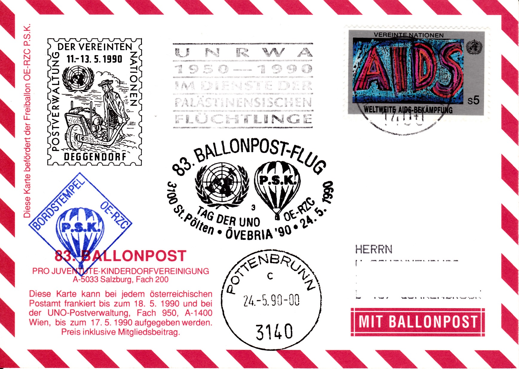 Diese Karte wurde bei der UN-Postverwaltung Wien für den 83. Ballonpostflug der Österreichischen Pro Juventute mit dem Freiballon OE-RZC aufgegeben und mit einem Maschinenstempel Wien-Vereinte Nationen gestempelt. Am 24.5.1990 wurde sie mit dem Freiballon OE-RZC befördert. Die Karte erhielt an diesem Tag den Sonderstempel aus St.Pölten mit der Kennziffer "3" zu diesem 83. Sonder-Ballonpostflug, einen Tagesstempel aus Pottenbrunn und einen Bordstempel.