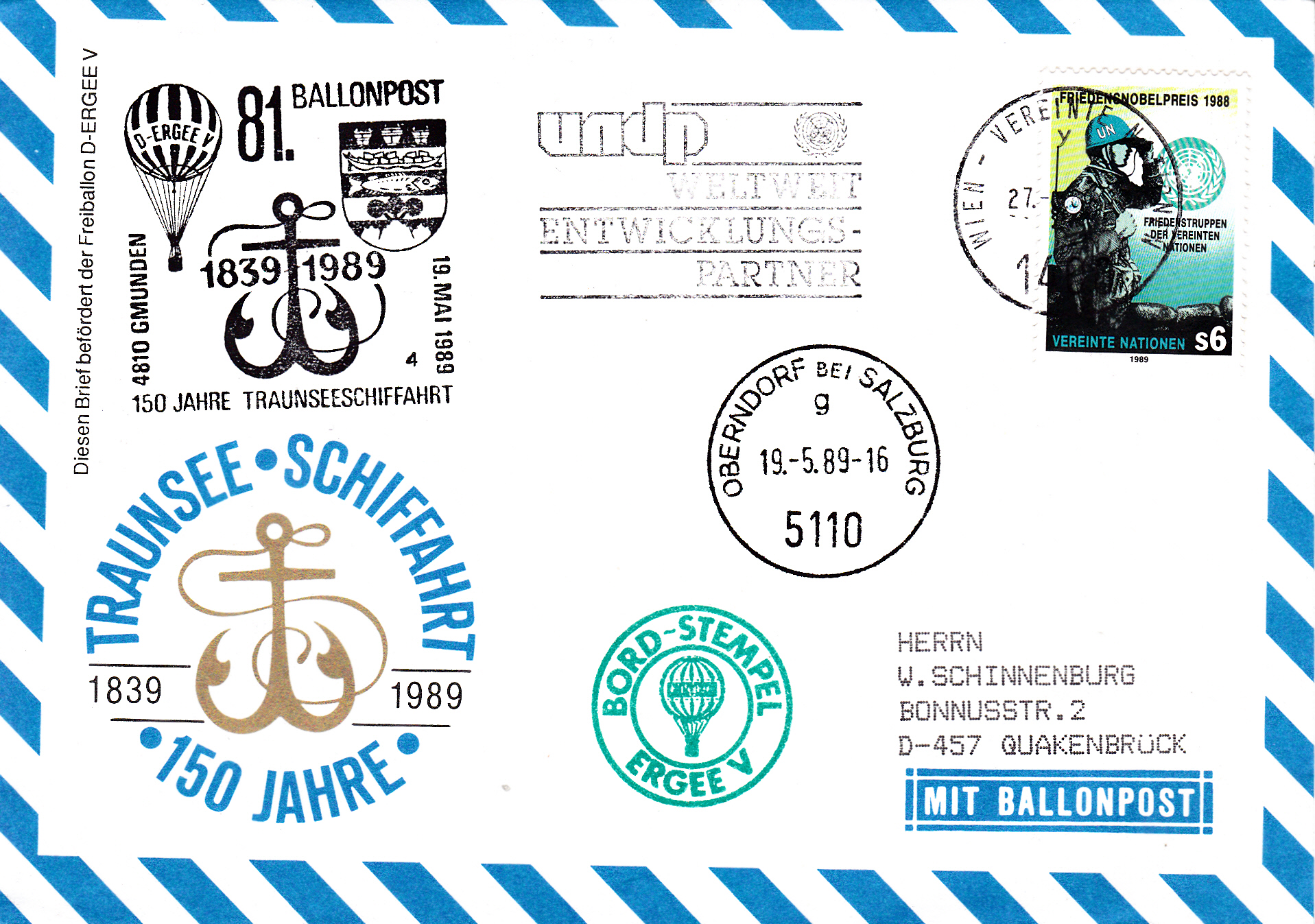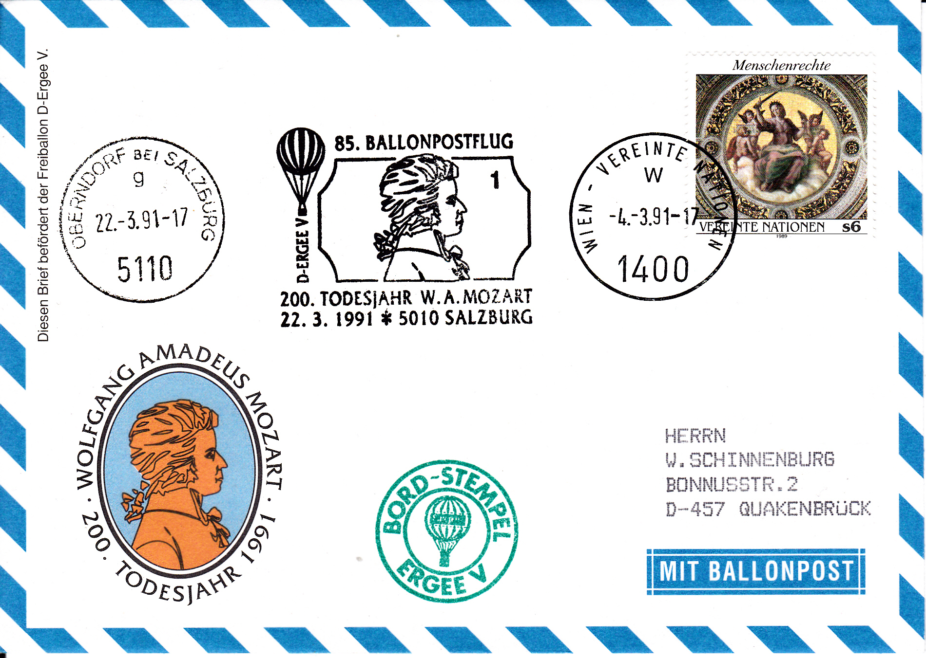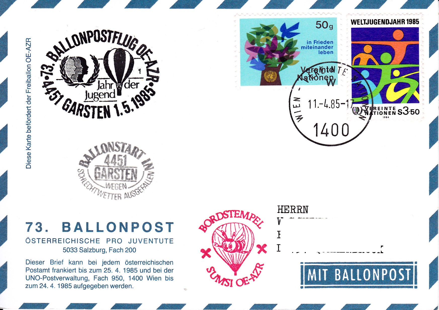 Dieser Brief wurde am Ersttag (26.6.1985) der Marke "40 Jahre Vereinte Nationen (UNO)" der UN-Postverwaltung Wien (MiNr 51 A) bei der Briefmarkenausstellung UNAUSPHILA'85 für den 32. Sonder-Ballonpostflug der Österreichischen Pro Juventute mit einem Ersttagsonderstempel zur Ausstellung mit der Kennziffer "1" gestempelt und am 20.7.1985 mit dem Freiballon OE-KZM befördert. Bei der Ausstellung wurde auch der Cachet-Stempel der UN-Postverwaltung Wien zur UNAUSPHILA'85 zusätzlich angebracht. Der Brief erhielt am 20.7.1985 einen Tagesstempel Wien Kennbuchstabe "f", den Sonderstempel zum 32. Sonder-Ballonpostflug mit der Kennziffer "3" und einen Bordstempel.