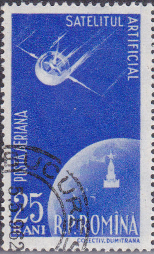 Zum Start der ersten beiden sowjetischen Erdsatelliten (Sputnik 1 und Sputnik 2) erschien in Rumänien diese dunkelblaugrüne Marke (MiNr 1677) mit einem Satellit und einem Teil der Erdkugel.