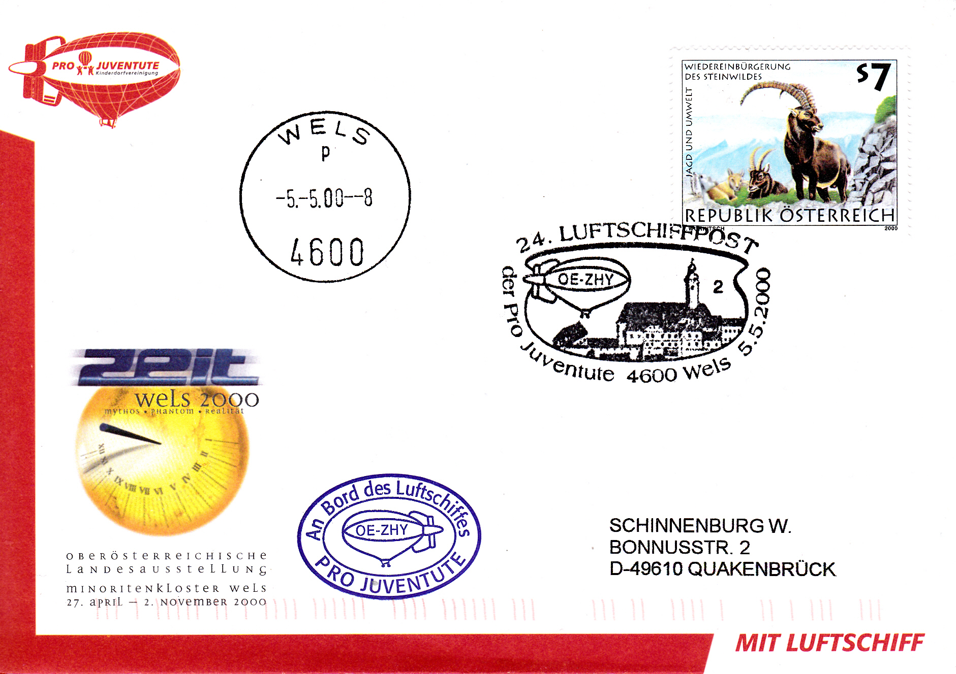 Dieser Brief wurde am 5.5.2000 bei einem Sonderpostamt in Wels für die 24. Luftschiffpost der Pro Juventute mit dem Luftschiff OE-ZHY aufgegeben. Die Marke wurde mit einem Sonderstempel mit der Kennziffer "2" gestempelt und am gleichen Tag mit dem Luftschiff OE-ZHY befördert. Der Brief erhielt noch einen Ortsstempel aus Wels mit dem Kennbuchstaben "p" und einen Bordstempel.