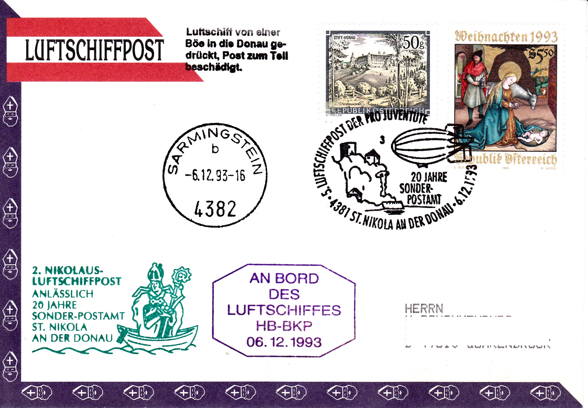 Dieser Brief wurde am 6.12.1993 in St. Nikola an der Donau für die 5. Luftschiffpost der Pro Juventute und 2. Nikolaus-Luftschiffpost mit dem Luftschiff HB-BKP aufgegeben. Die Marke wurde mit dem passenden Sonderstempel aus St. Nikola an der Donau mit der Kennziffer "3" gestempelt. Es wurde auch noch ein Tagesstempel aus Sarmingstein und der Bordstempel auf dem Brief angebracht. Außerdem erhielten alle Briefe noch einen Zusatzstempel "Luftschiff von einer Böe in die Donau gedrückt, Post zum Teil beschädigt".