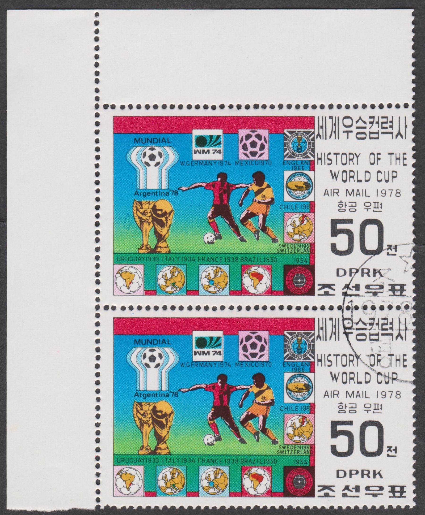 Nordkorea MiNr. 1744 erschien am 01.06.1978 und zeigt die Geschichte der Fußball-Weltmeisterschaften in Form der Embleme der Austragungsländer von 1930 bis 1978: