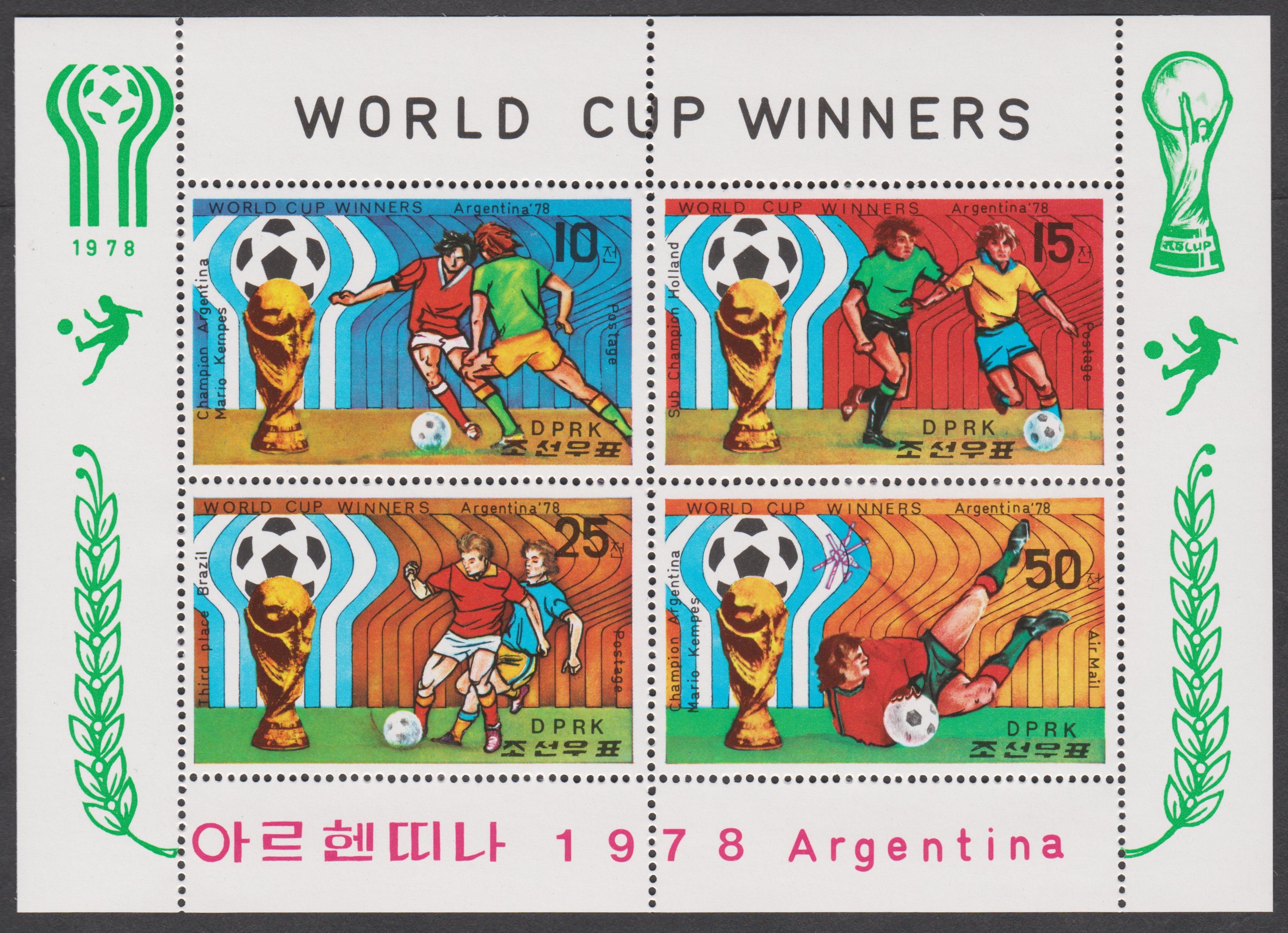 Nordkorea Block 52 A mit MiNr. 1777 - 1780 erschien am 15.12.1978 und würdigt Argentinien als Weltmeister, Holland als Vizeweltmeister sowie Brasilien als Mannschaft auf dem dritten Platz dieser WM: