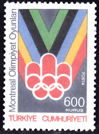 Eine zweite Marke (MiNr 2299) dieser Ausgabe der Türkei zeigt eine Symbolik mit der Jahreszahl 76 und fünf Streifen in den Farben der Olympischen Ringe.
