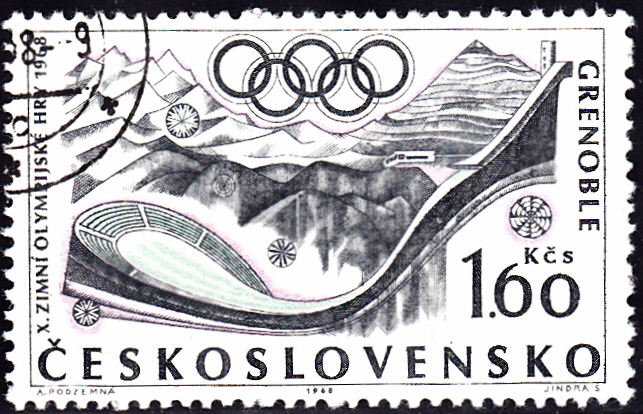 Aus der Tschechoslowakei kommt diese Marke (MiNr 1765) zu den Winterspielen 1968 mit mit der Sprungschanze.