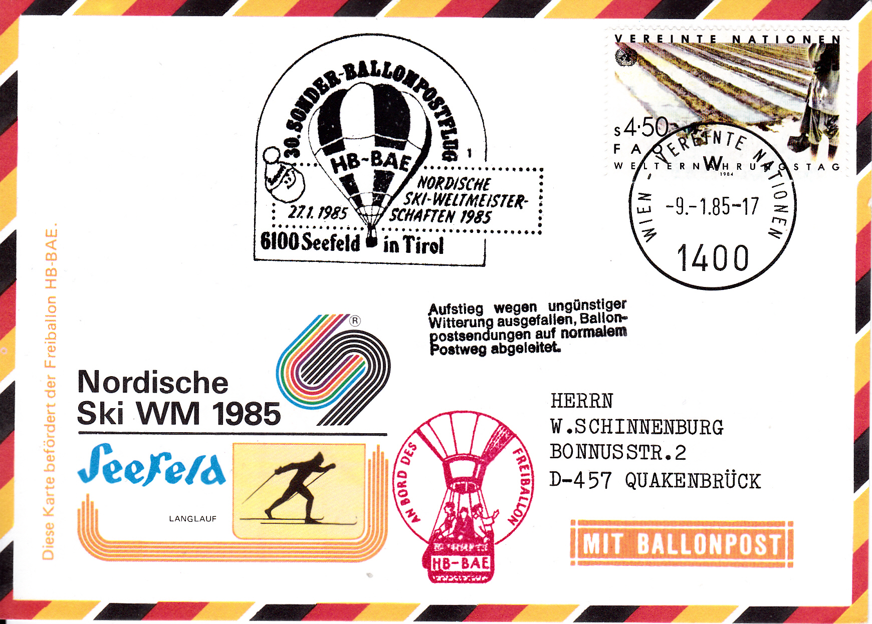 Diese Karte wurde am 9.1.1985 bei der UN-Postverwaltung Wien für den 30. Sonder-Ballonpostflug der Österreichischen Pro Juventute mit dem Freiballon HB-BAE aufgegeben und mit dem Tagesstempel mit dem Kennbuchstaben "w" gestempelt und sollte am 27.1.1985 mit dem Ballon HB-BAR befördert werden. Die Karte erhielt an diesem Tag den Sonderstempel aus Seefeld in Tirol mit der Kennziffer "1" zu diesem 30. Sonder-Ballonpostflug. Die Karte erhielt auch einen Bordstempel und, da der Ballonflug wegen ungünstiger Witterungsverhältnissen ausgefallen ist, einen "Ausfallstempel".
