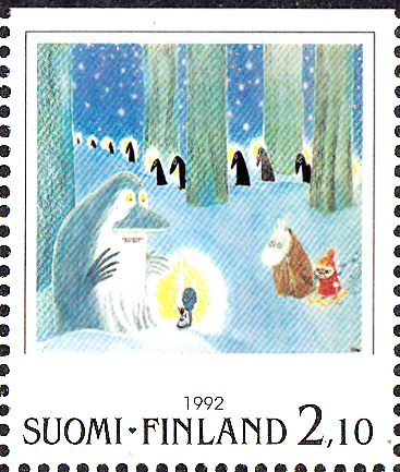 Zur Internationalen Briefmarkenausstellung NORDIA ’93 in Helsinki erschienen in Finnland Marken mit Abbildungen zu "Die Mumins". Auf dieser Marke (MiNr 1189) sehen wir eine Zeichnungen aus dem Buch "Winter im Mumintal".