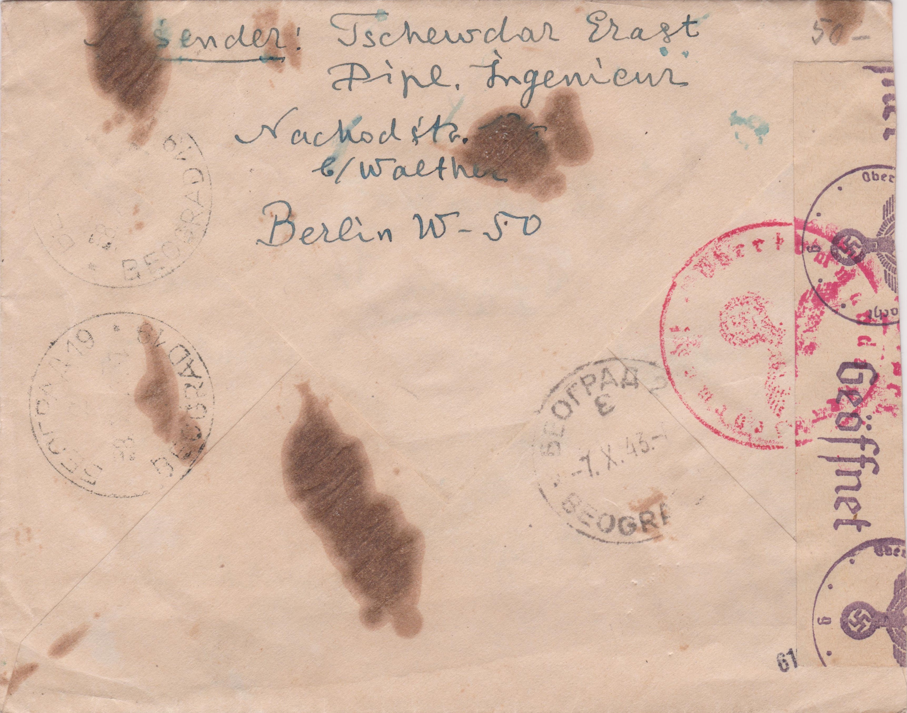 Laut rückseitig abgeschlagenem Tagesstempel kam der Brief dann am 07.10.1943 an seinem Bestimmungsort BELGRAD an.