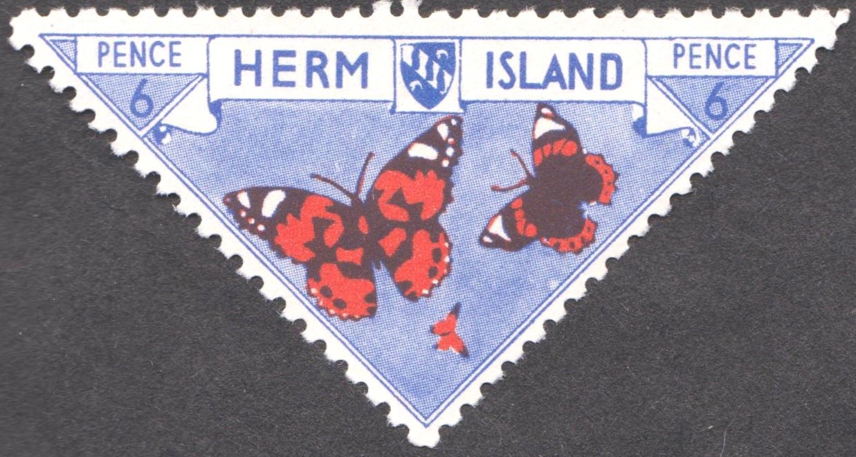 Auch dreieckige Lokalmarken "HERM ISLAND" mit Schmetterlingsmotiven wurden verausgabt: