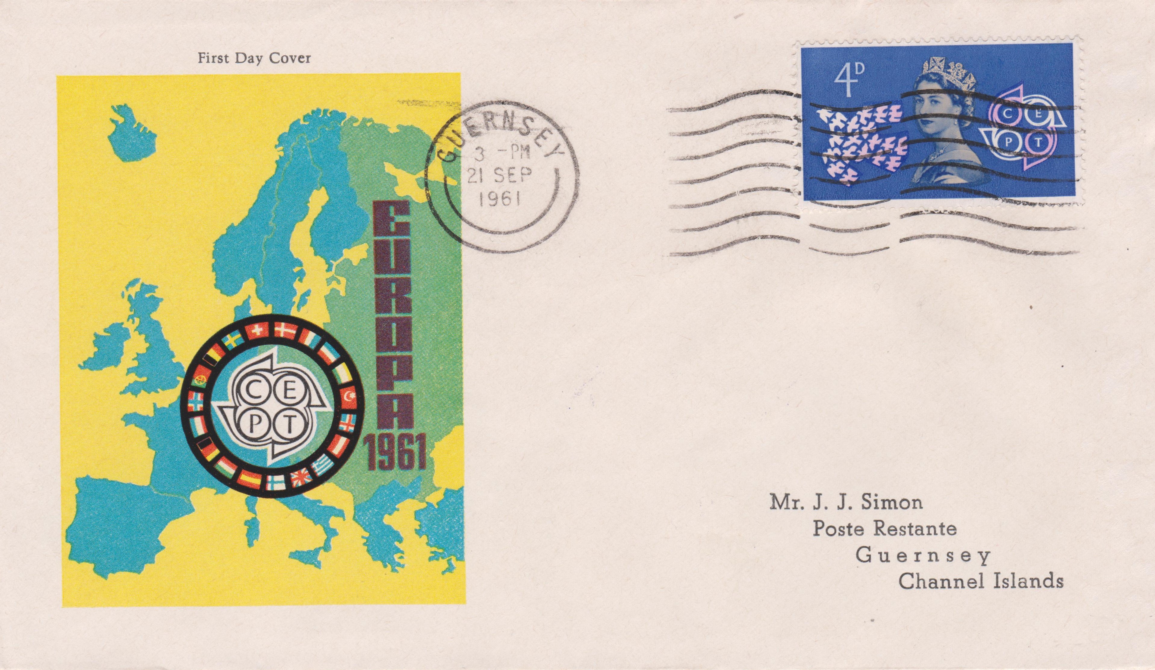 Dieser Beleg kombiniert am 21.09.1961 die Lokalmarken auf der Rückseite mit einer der drei in Großbritannien am 18.09.1961 erschienenen Europamarken: