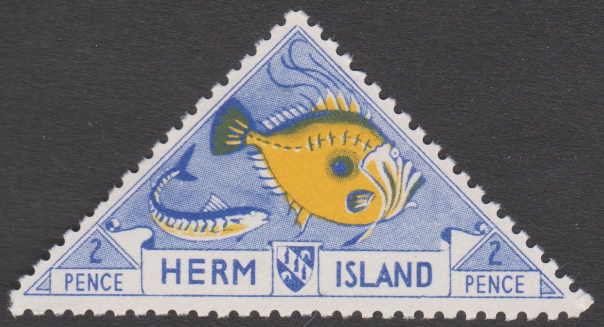 Auch dreieckige Lokalmarken "HERM ISLAND" mit Fischmotiven wurden verausgabt: