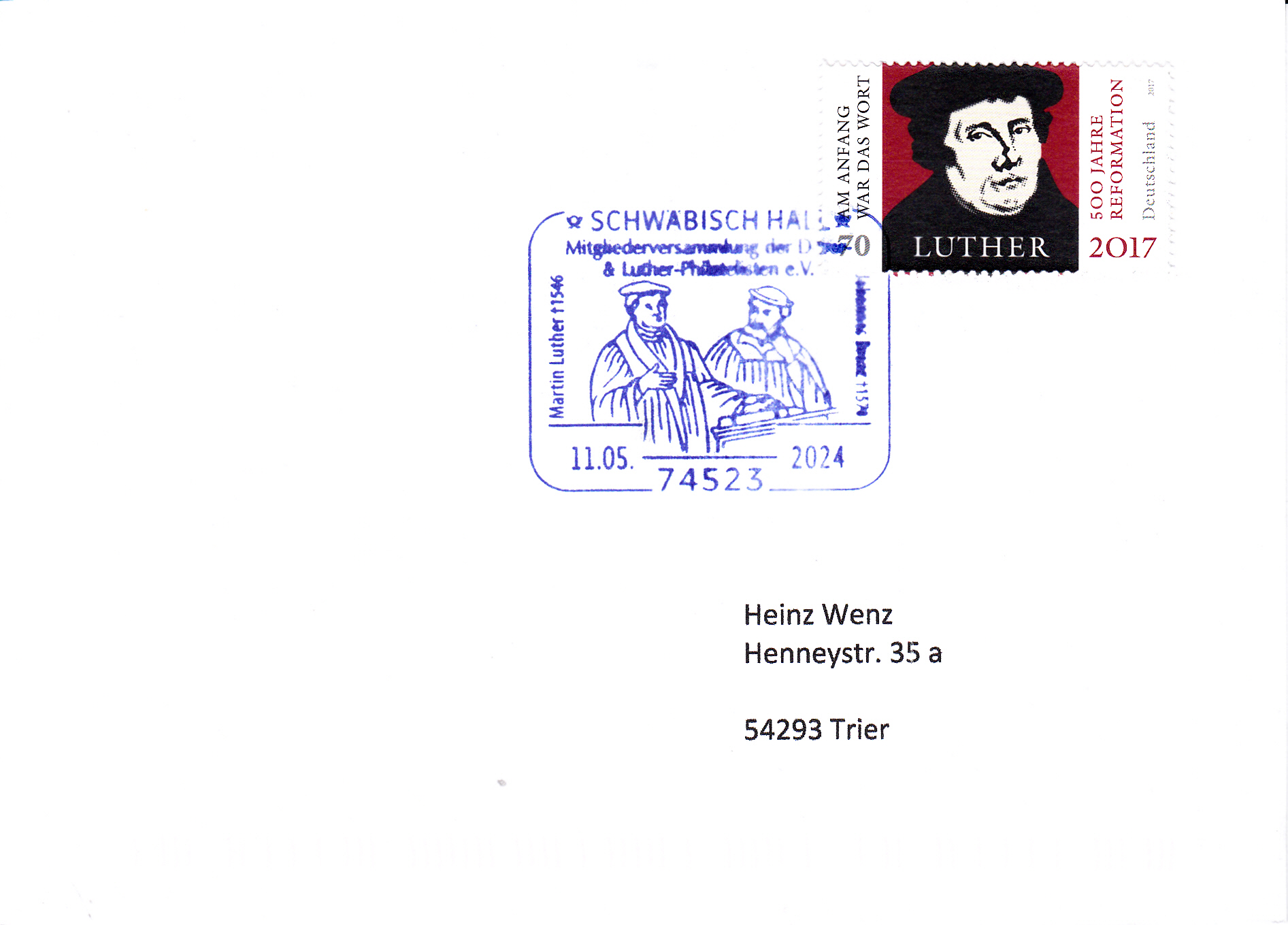 Postkarte mit dem Sonderstempel vom 11.5.2024 aus Schwäbisch Hall zur Mitgliederversammlung der Dürer & Luther-Philatelisten e.V. mit der Abbildung "Martin Luther und Johannes Brenz bei der Heidelberger Disputation 1518".