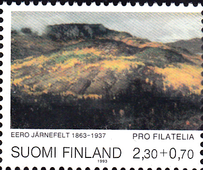 Auf dieser Marke aus Finnland (MiNr 1200) wird ein Teil des Gemälde "Herbstlandschaft am Pielisjärvi" gezeigt.