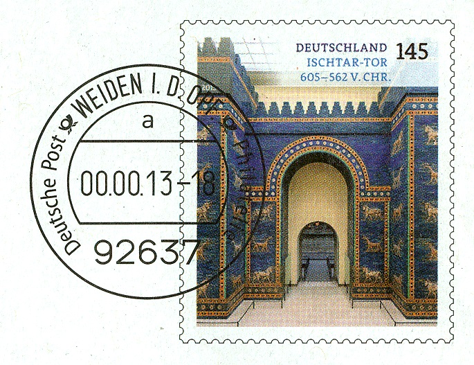 Das Vorausentwertungsdatum "22.-4.13 - 18" auf dem Wertstempel "Ishtartor" (145 Cent).