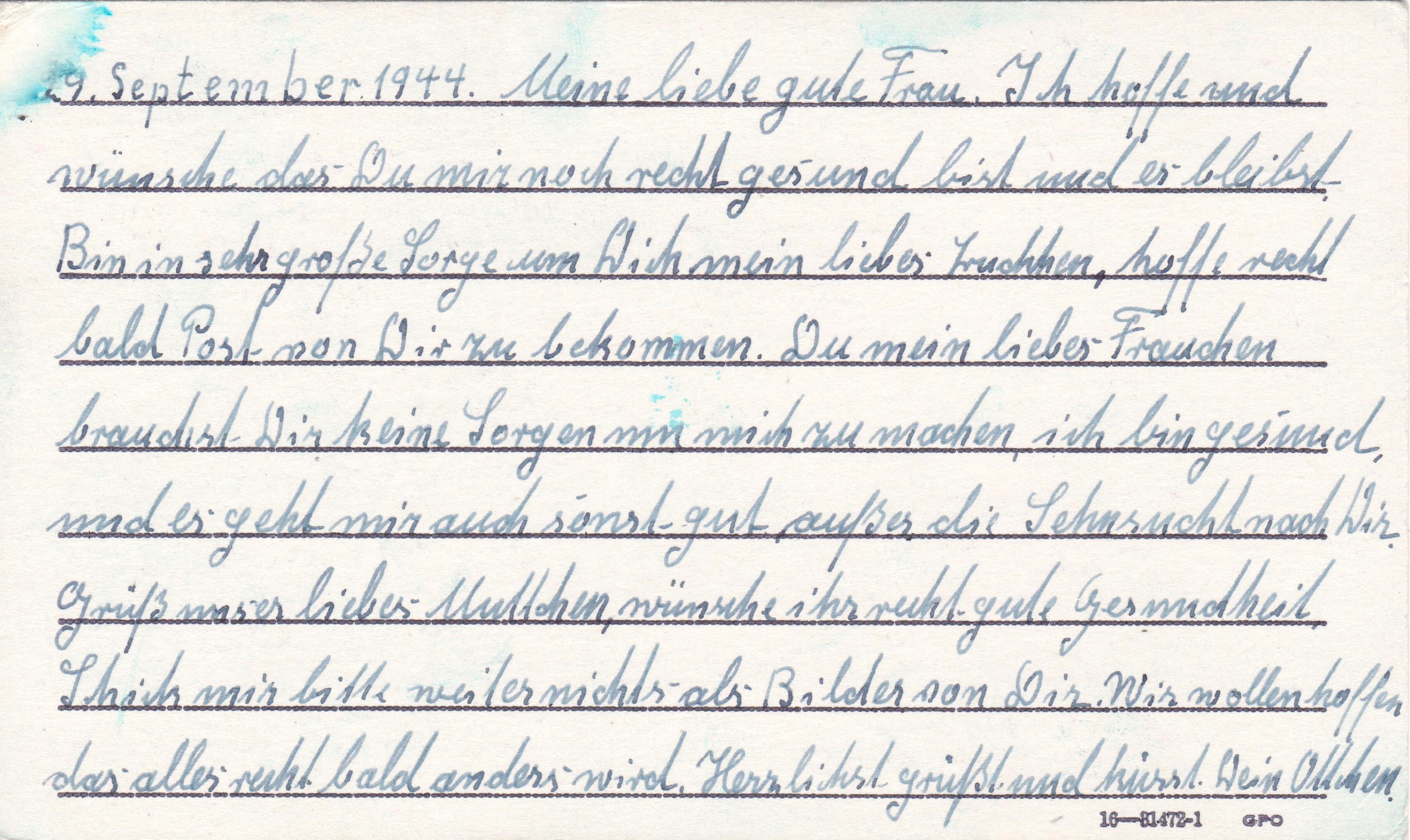 Dieser Faltbrief "PRISONER OF WAR" wurde am 10.09.1944 von einem Uffz. (= Unteroffizier) Karl Flege im "Prisoner of War Camp Swift, Texas" geschrieben und adressiert nach "Klostergrab Krs. Dux Sudetengau":
