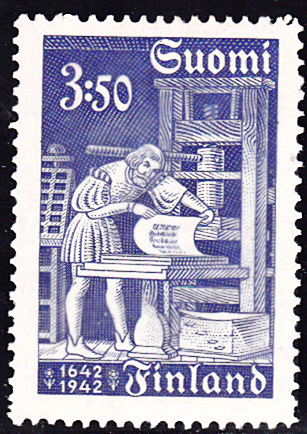 Zum 300. Jahrestag der ersten Bibelausgabe in finnischer Sprache erschien in Finnland diese Marke (MiNr 268) mit einem Drucker im 17. Jahrhundert.