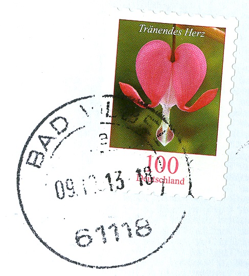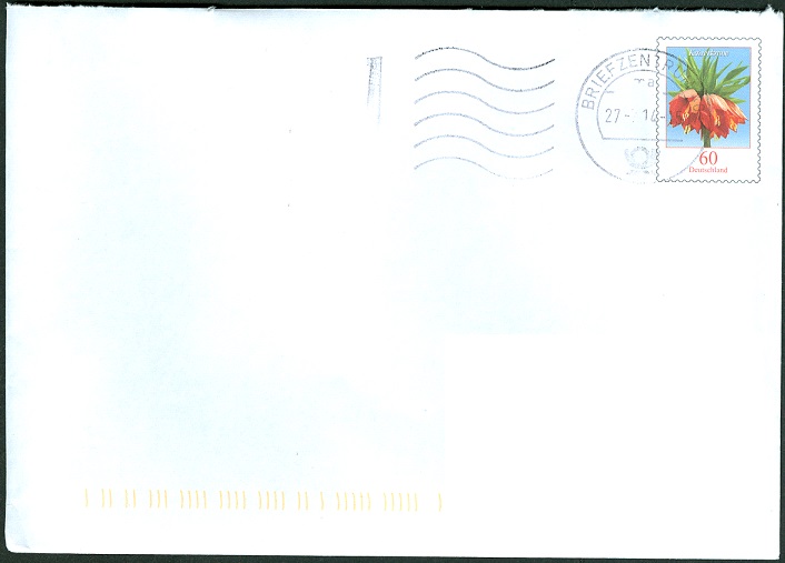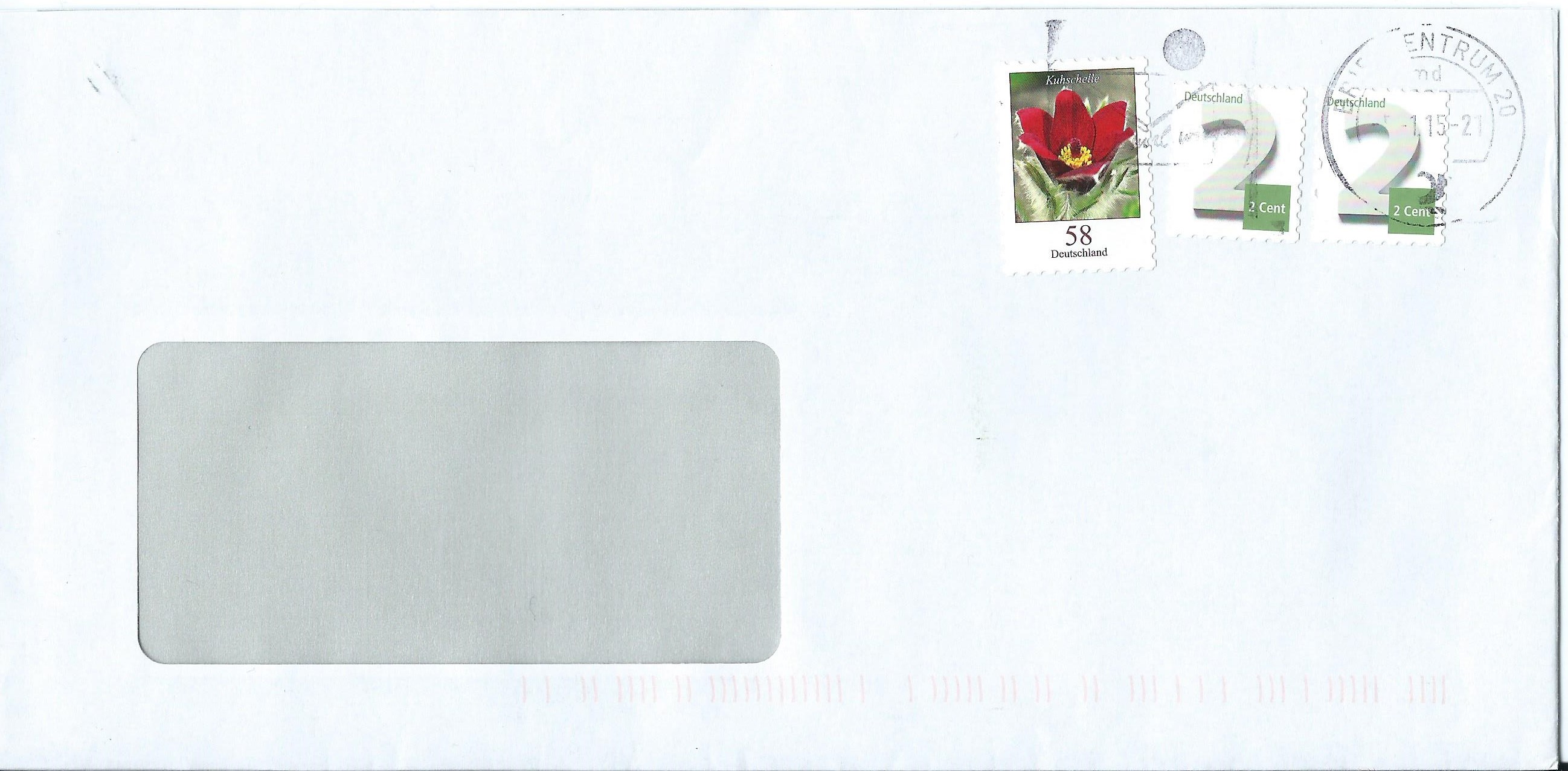 von mir gibt es heute auch mal eine Blume: Die selbstklebende zu 58 ct "Kuhschelle" zusammen mit 2 selbstklebenden Ergänzungswerten zu 2 ct auf einem Standartbrief in der Portostufe 62 ct. Das ganze gestempelt am 5.1.15 im Briefzentrum 20. Interessant an der Abstempelung ist der kreisrunde Fleck oben im Werbeeinsatz. Normalerweise kennen wir den ja "nur" als Brief mit der Inschrift "schreib mal wieder" ohne weitere Zusätze. Hier ist der Werbeeinsatz nicht richtig fest in die Maschine gesetzt worden und daher stempelt da (wahrscheinlich) ein Schraubenkopf mit. Das sieht man auch nicht alle Tage und ich kenne z. B. einen Sammlerfreund, der sich über diesen Abschlag riesig freuen wird, da er speziell Briefzentrumstempel sammelt und solche Abweichungen immer gesucht sind. Also selbst bei solcher unscheinbarer "Massenware" kann noch interessantes entdeckt werden