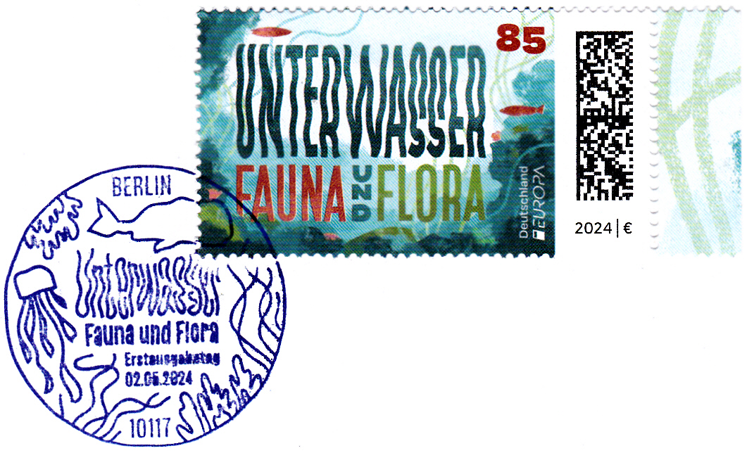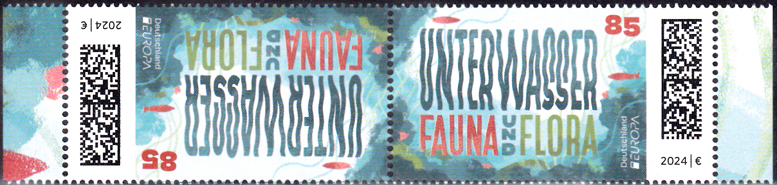Die Europamarke 2024 ist bei der Deutschen Post am 2. Mai 2022 zum Thema "Unterwasserfauna und -flora" erschienen. Die Marke zu 85 Cent zeigt die Darstellung "Wabernde Inschrift vor Gewässergrund mit Wasserpflanzen und Fischen".