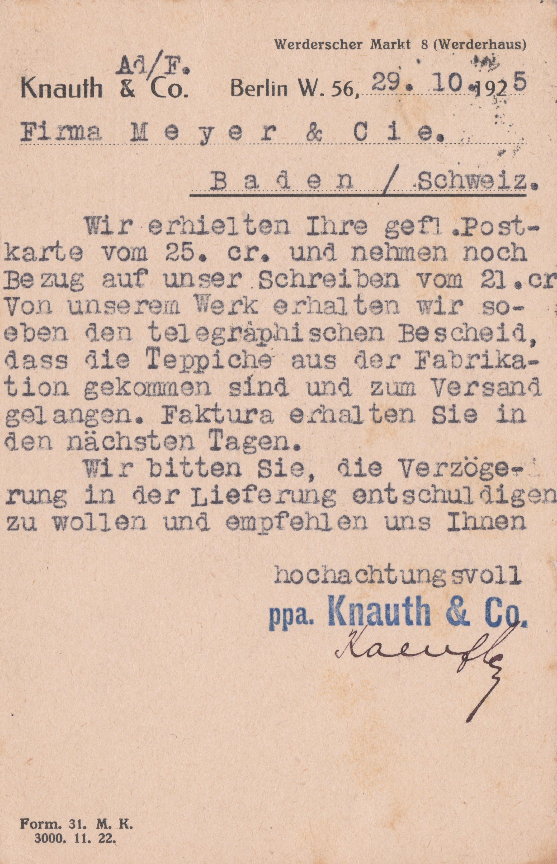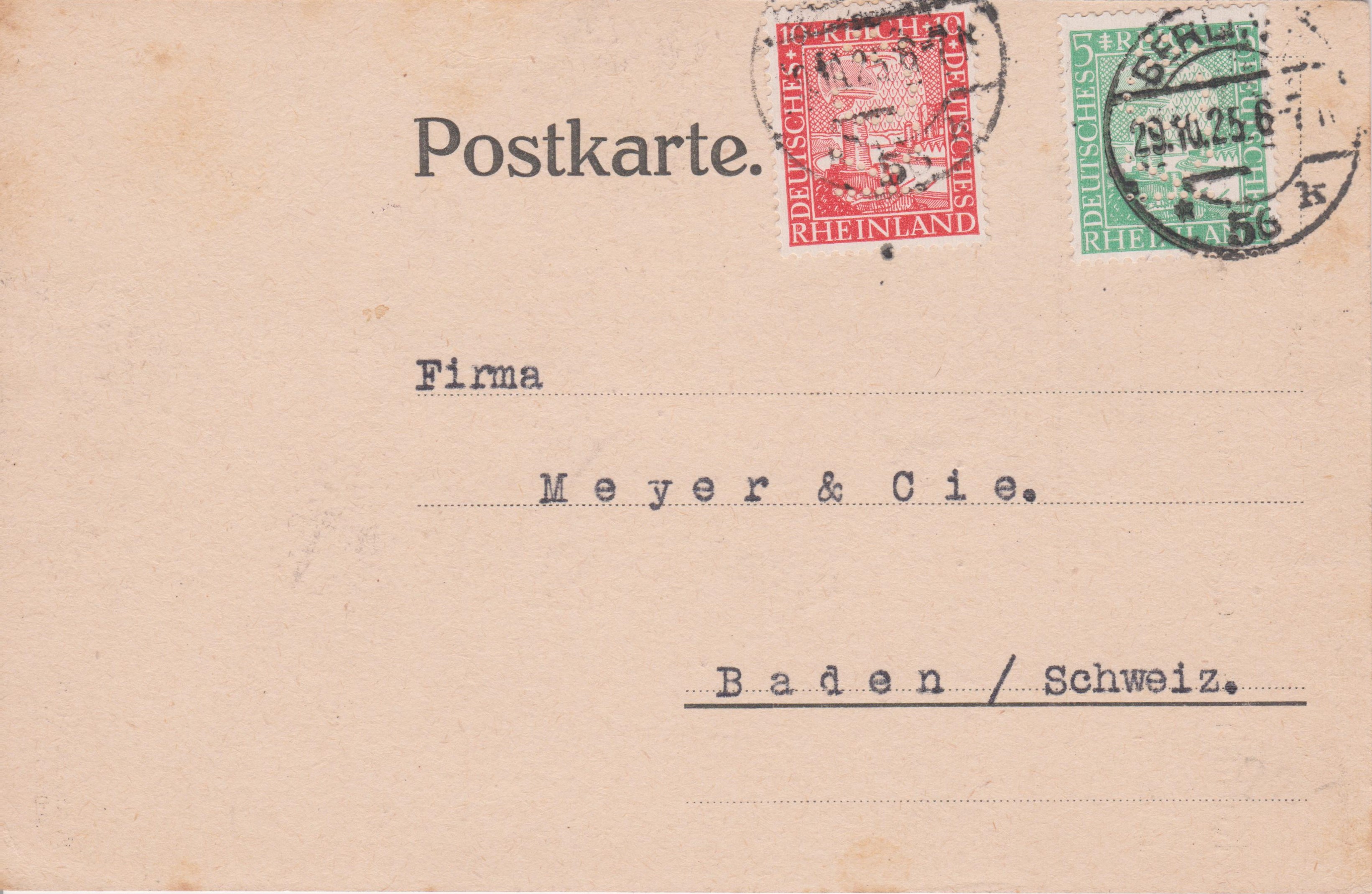 Diese Postkarte nach "Baden / Schweiz" wurde am 29.10.1925 portogerecht mit 15 Pf frankiert in BERLIN 56 aufgegeben: