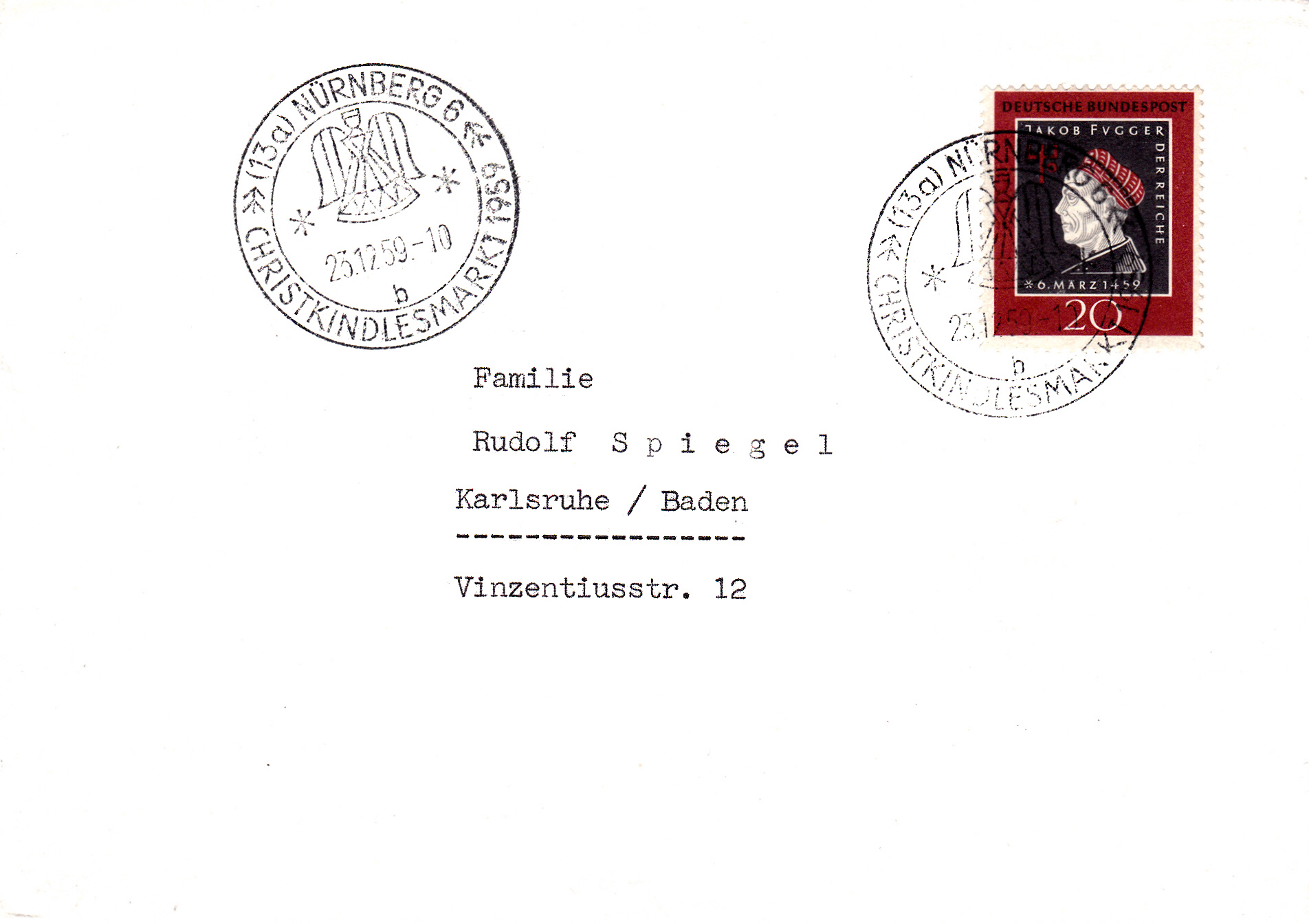 Einzelfrankatur der Marke zum 500. Geburtstag von Jakob Fugger (MiNr 307) auf einem Brief vom 23.12.1959 von Nürnberg nach Karlsruhe.