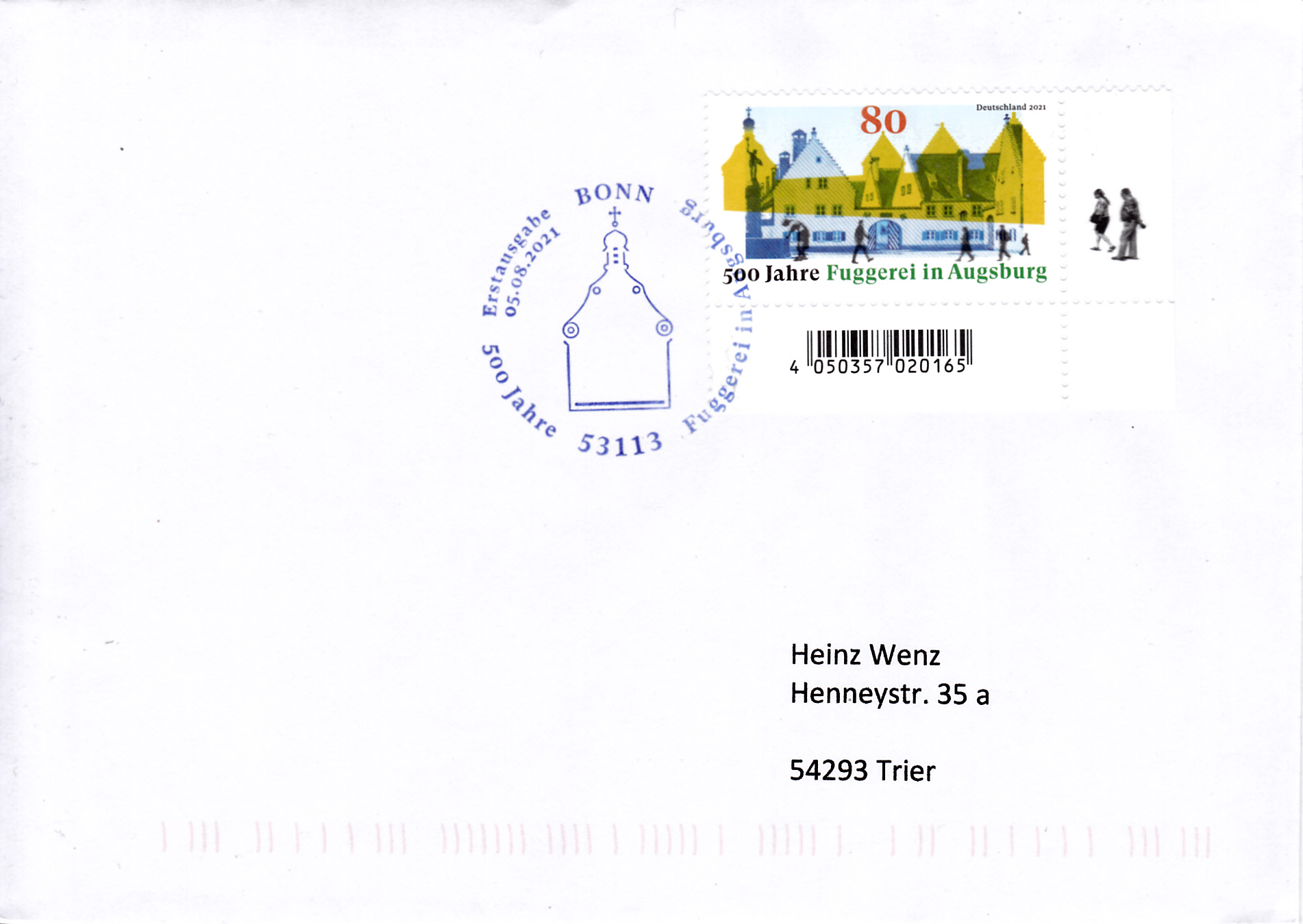 Brief mit der Marke "500 Jahre Fuggerei in Augsburg" und dem Ersttagsonderstempel aus Berlin.