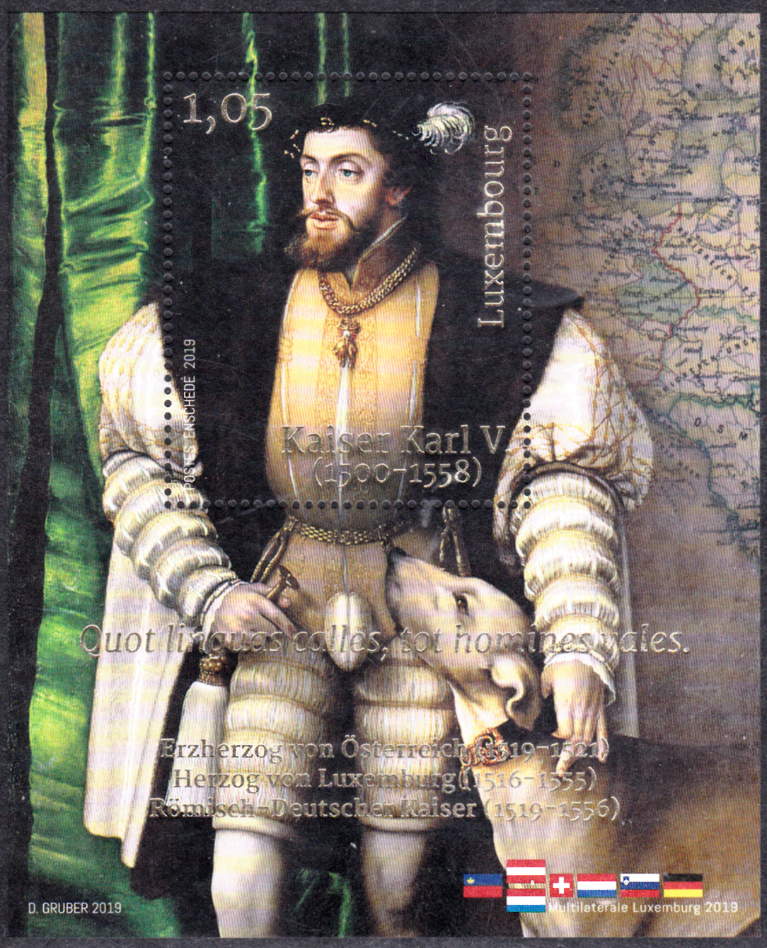 Dieser Block aus Luxemburg (MiNr Block 44 mit Marke MiNr 2212) zeigt einen Ausschnitt aus dem Gemälde "Kaiser Karl V. mit Hund" von Jakob Seisenegger.