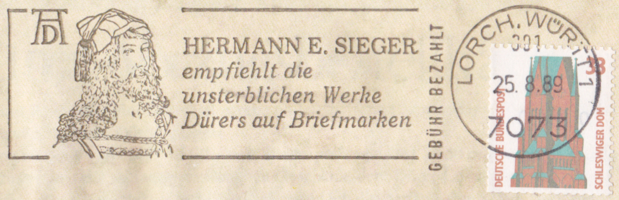 Dieser Absenderentwerter-Stempel der Firma Sieger vom 25.8.1989 zeigt in der Werbefahne ein Selbstbildnis von Albrecht Dürer aus dem Gemälde "Selbstbildnis mit Landschaft".