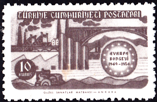 Zum Jubiläum "5 Jahre Europarat" ist in der Türkei diese Marke (MiNr 1391) mit einer allegorischen Darstellung zum Thema "Wirtschaftliche Entwicklung" erschienen.