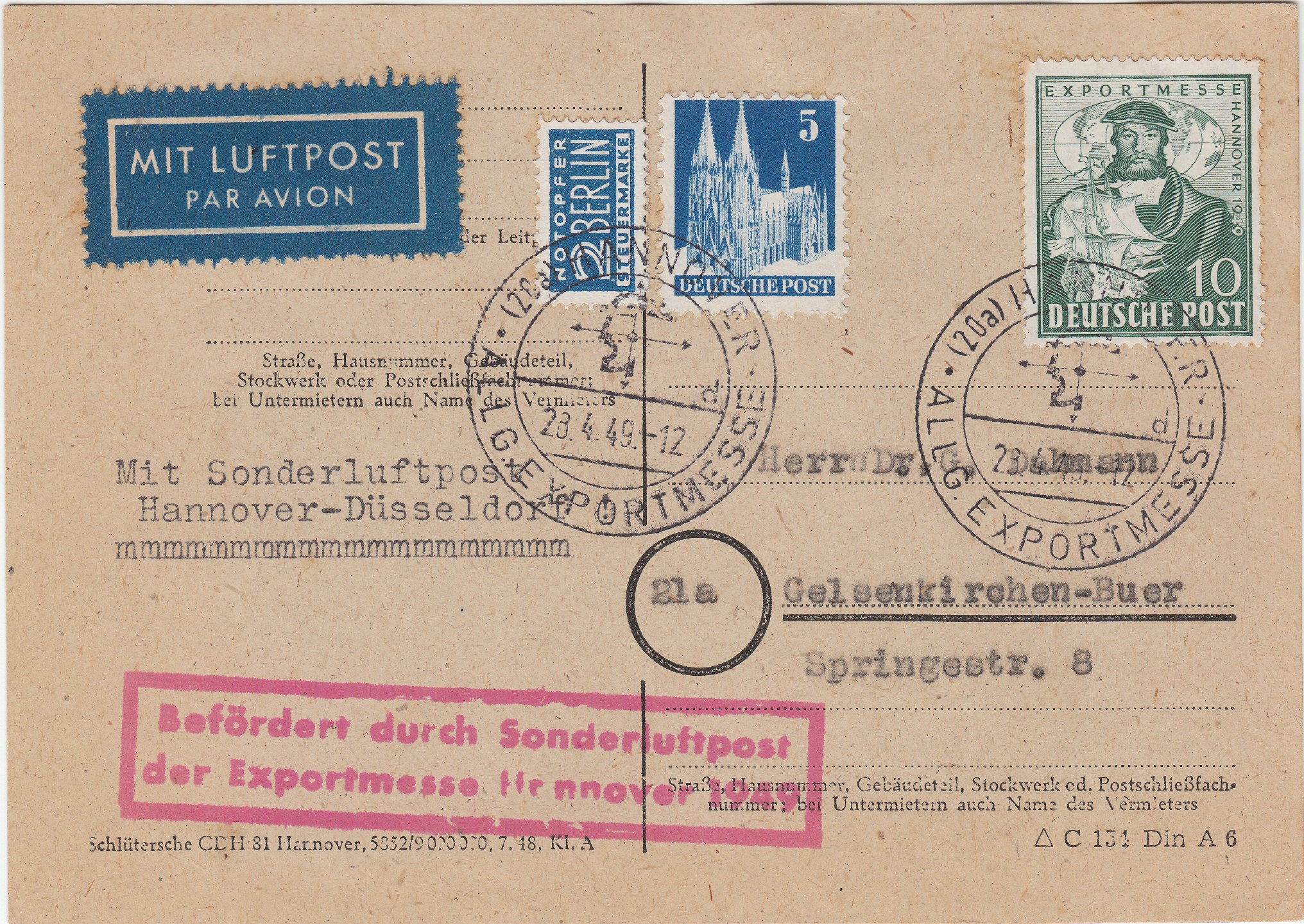 Befördert wurde der Beleg durch Sonderluftpost der Exportmesse Hannover 1949 von Hannover nach Düsseldorf.