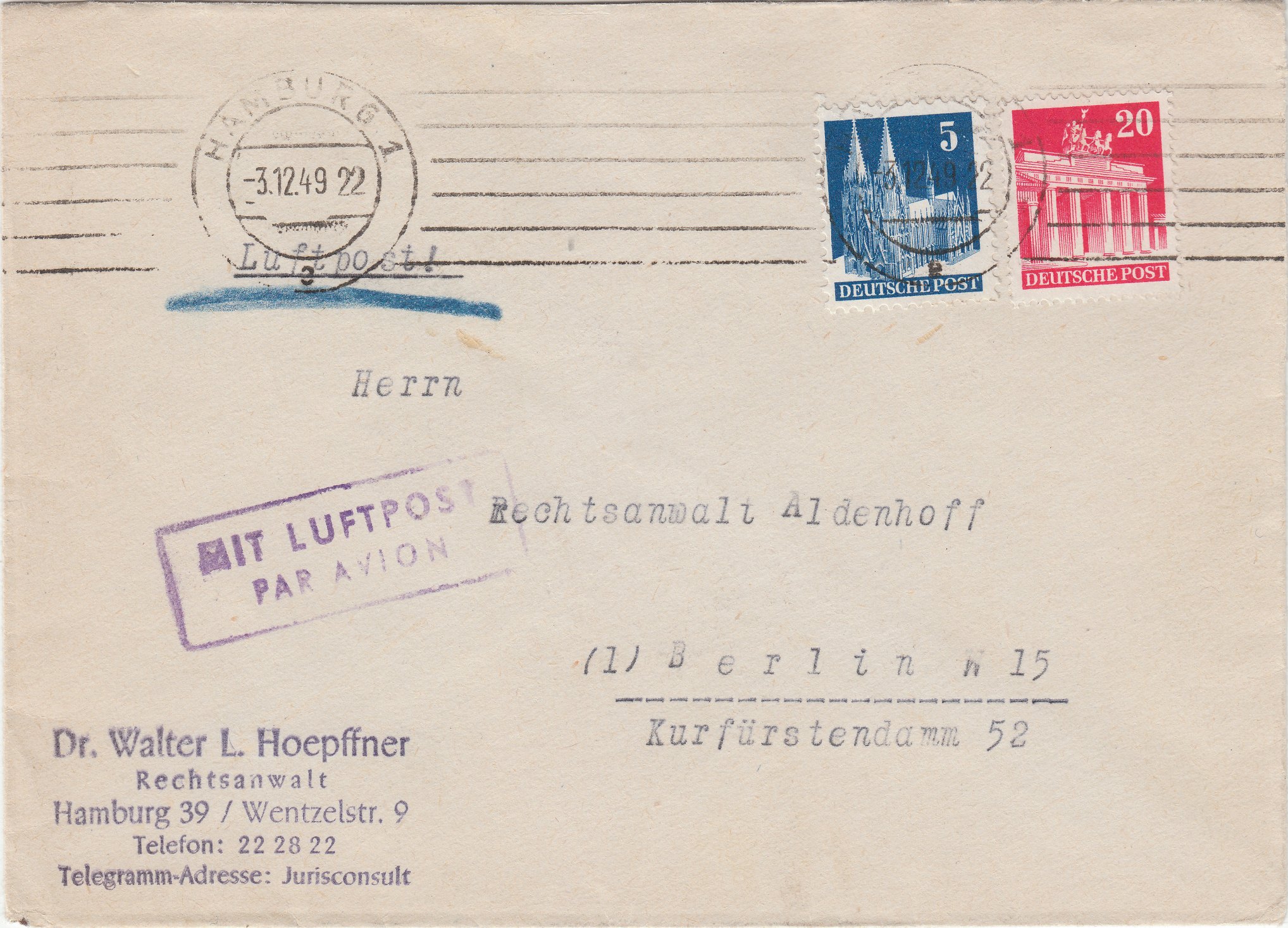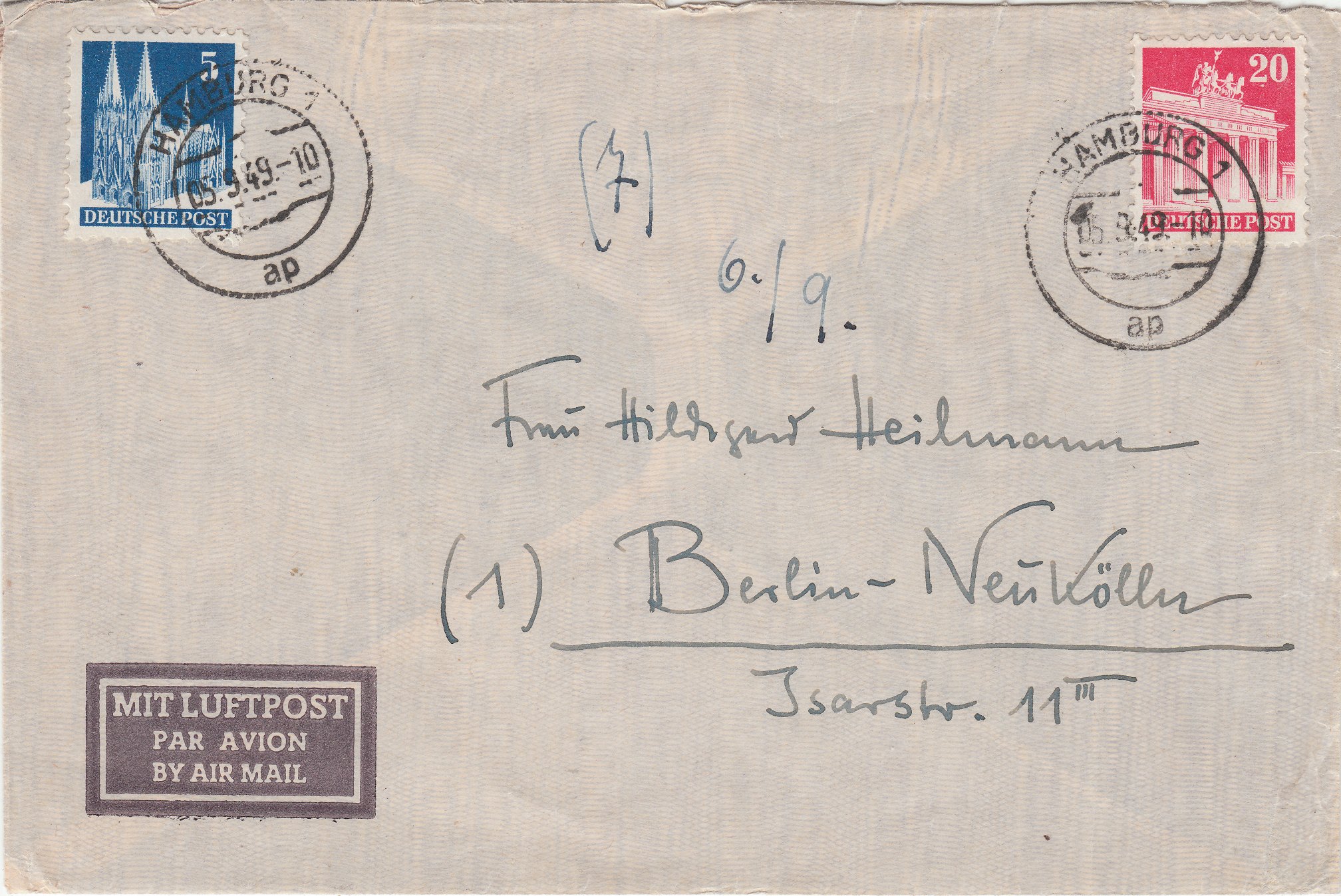 Postkarte im Fernverkehr (10 Pf) per Luftpost (5 Pf), portogerecht frankiert als MiF per einer 5 Pf Freimarke der Bautenserie sowie einer 10 Pf Sondermarke der am 22.04.1949 erschienenen Ausgabe zur Exportmesse Hannover: