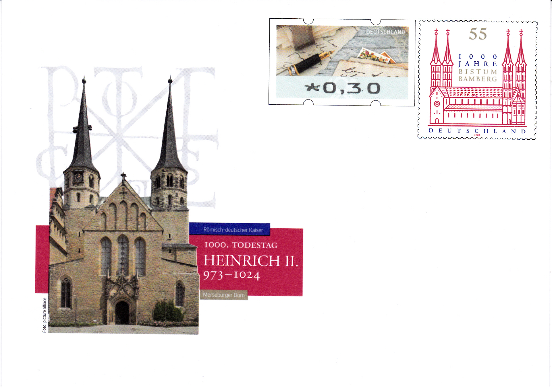 Zum 1000. Todestag von Kaiser Heinrich II. erschien dieser Ganzsachenumschlag mit einem Wertstempel "1000 Jahre Bistum Bamberg" (MiNr 2579) mit dem Bamberger Dom und einer Automatenmarke zu 0,30€.