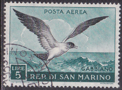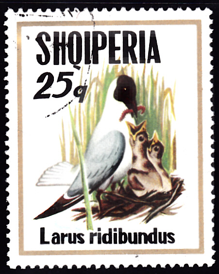 Hier eine Marke aus Rumänien (MiNr 1692) mit einer fliegenden Lachmöwe (Larus ridibundus).