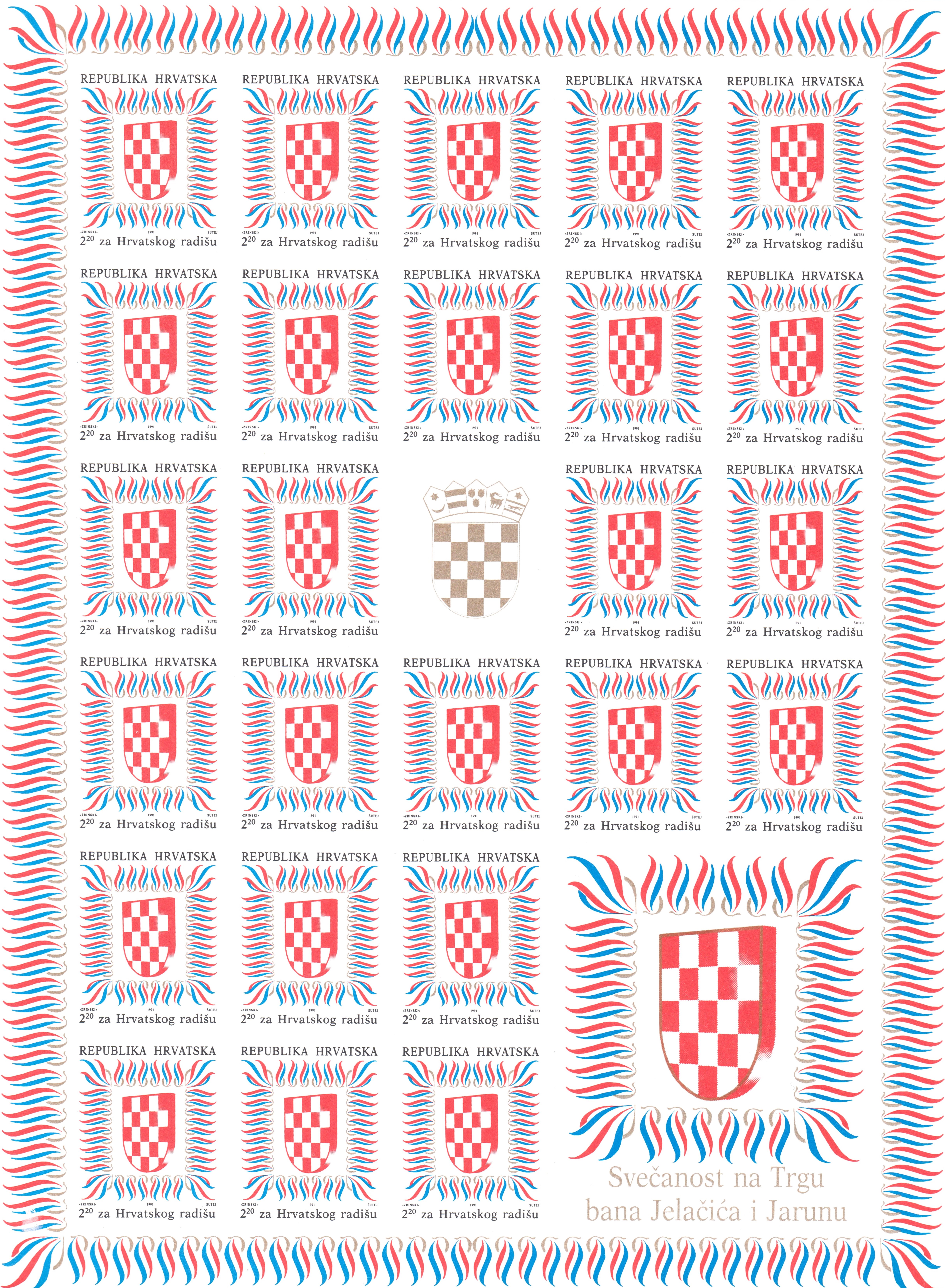 Kroatien Zwangszuschlagsmarken MiNr. 40-41 wurden zusammenhängend in Kleinbogen zu 8 Marken gedruckt, hier Kleinbogen I, obere Reihe 4 x MiNr. 40, untere Reihe 4 x MiNr. 41: