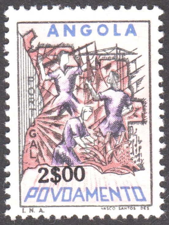 Diese drei Werte "Neusiedler", Angola Zwangszuschlagsmarken MiNr. 22 bis 24, erschienen am 01.09.1965 und zeigen die Motive "Karte Angolas" sowie "Gewerbetätigkeit":