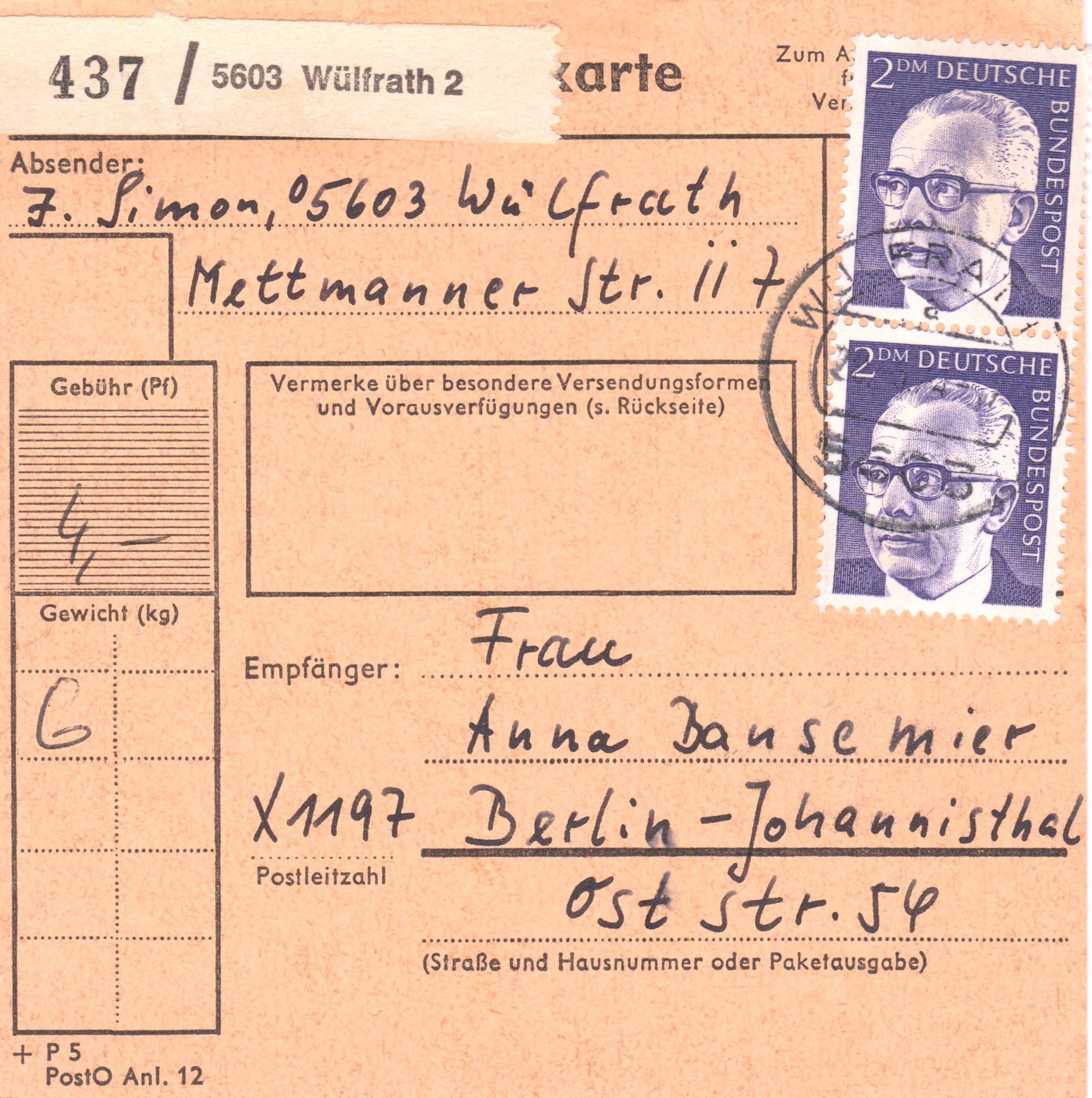 Paketkarte mit Mehrfachfrankatur 2 x 2 DM zur Abdeckung der Portostufe von 4 DM für ein Paket mit einem Gewicht von 6 kg in die DDR, aufgegeben in 5603 Wülfrath 3: