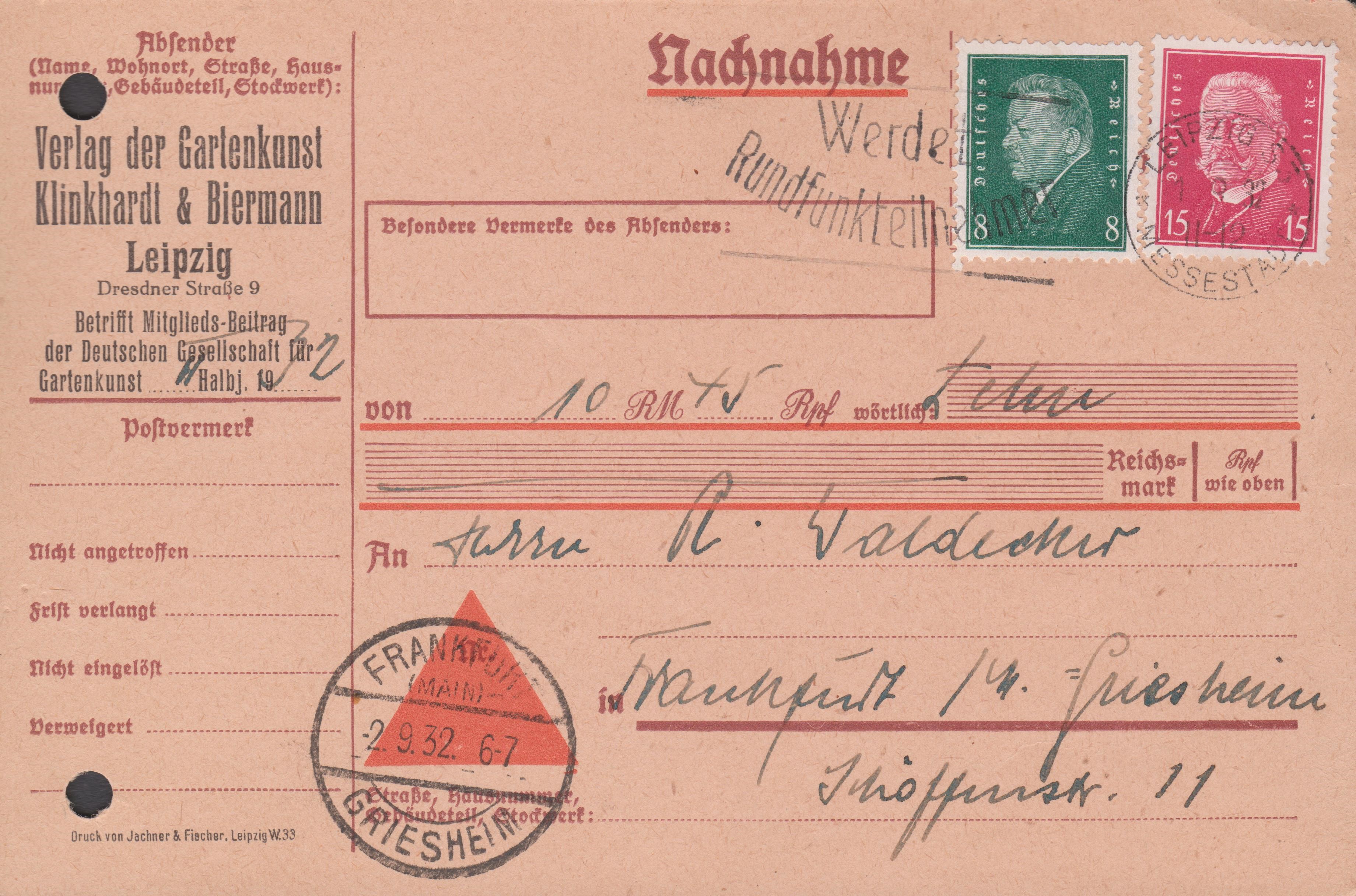 Fünf Beispiele für Drucksachen, Porto 3 Pf, per Nachnahem, Porto 20 Pf, die nicht vom Empfänger eingelöst wurden und an den Absender zurück gingen: