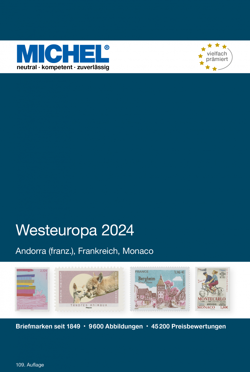 Am 5. April 2023 erschien der neue Michel Katalog Katalog Westeuropa 2024 (E 3) in der 109. Auflage in Farbe mit 978 Seiten im Format: 155 x 230 mm als Hardcover. Er kostet in Papierversion als Katalog 74,00 € und als E-Book in der Online-Bibliothek 49,00 €. Er enthält die Länder Andorra (franz.), Frankreich, Monaco.