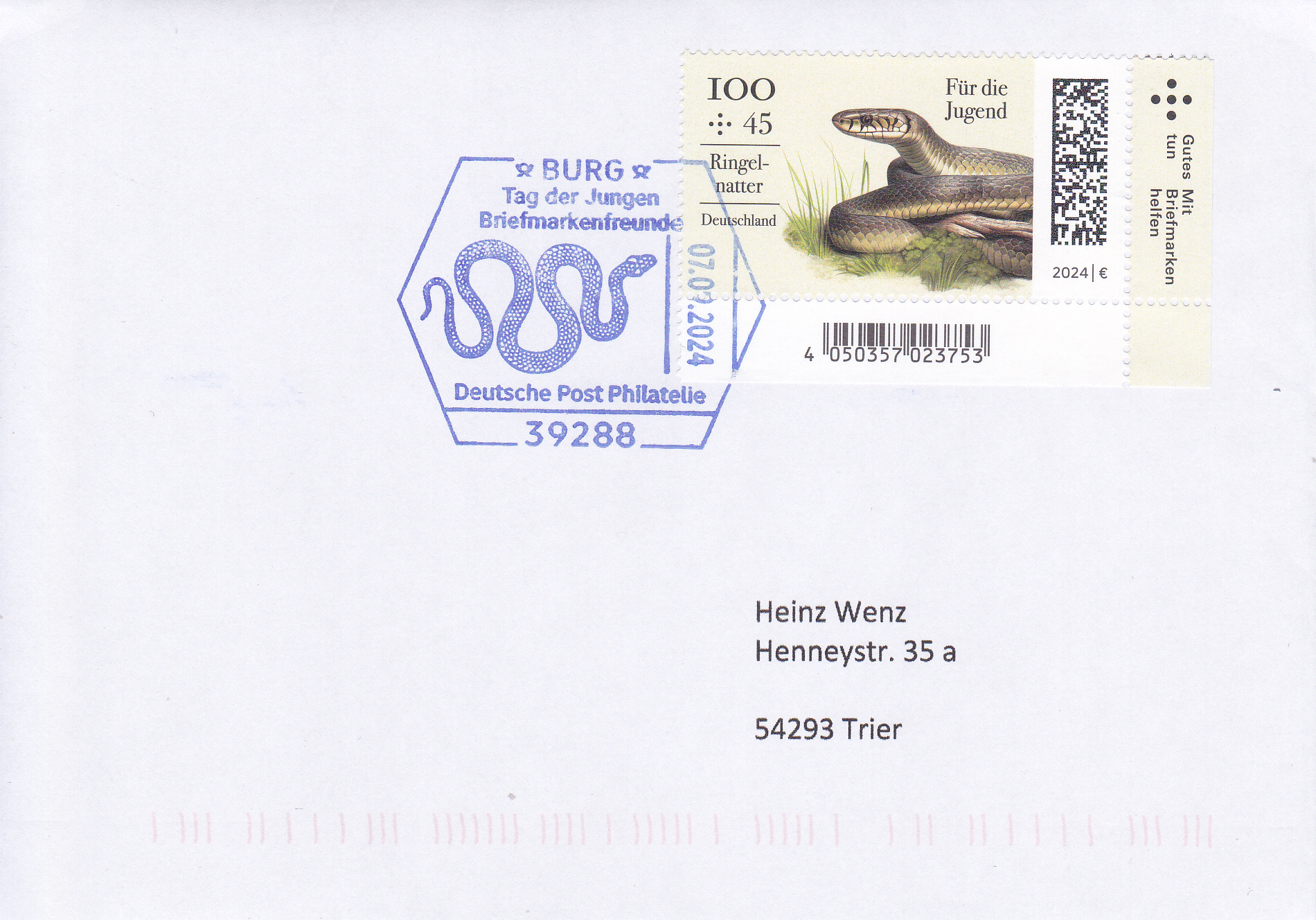 Brief mit der Jugendmarke 2024 zu 100+45 Cent (MiNr 3845) mit einer Ringelnatter (Natrix natrix) und dem Sonderstempel aus Burg vom 7.9.2024, der ebenfalls eine Ringelnatter abbildet.