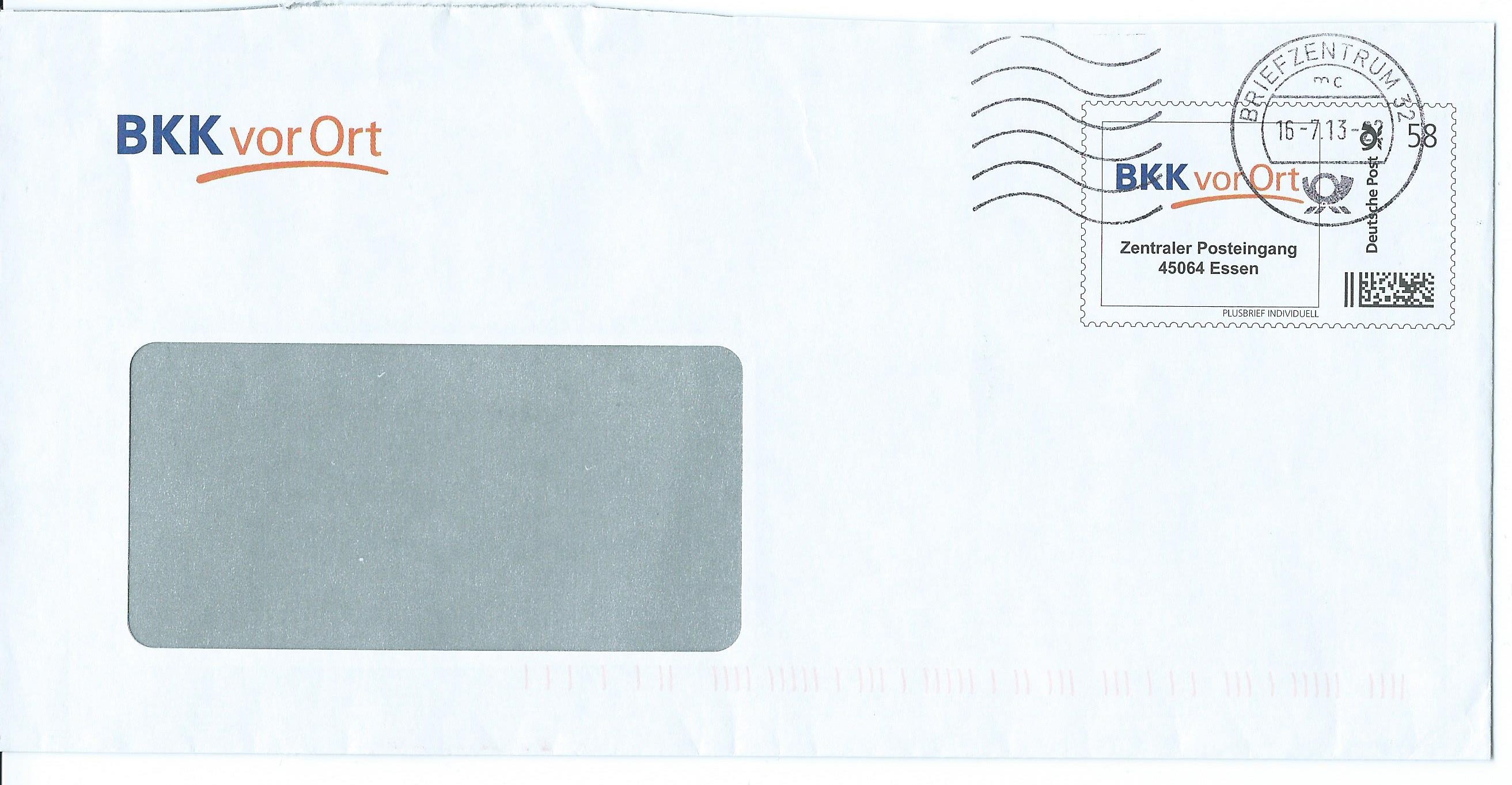 Nun folgen einige Umschläge der Krankenkassen. Zuerst einer der BKK vor Ort mit Wertstempel 58 ct. Gestempelt wurde der Beleg im Briefzentrum 32 am 16.7.13.