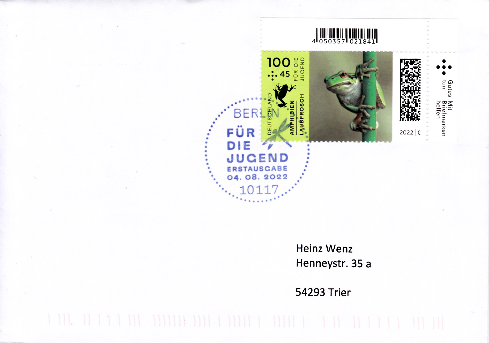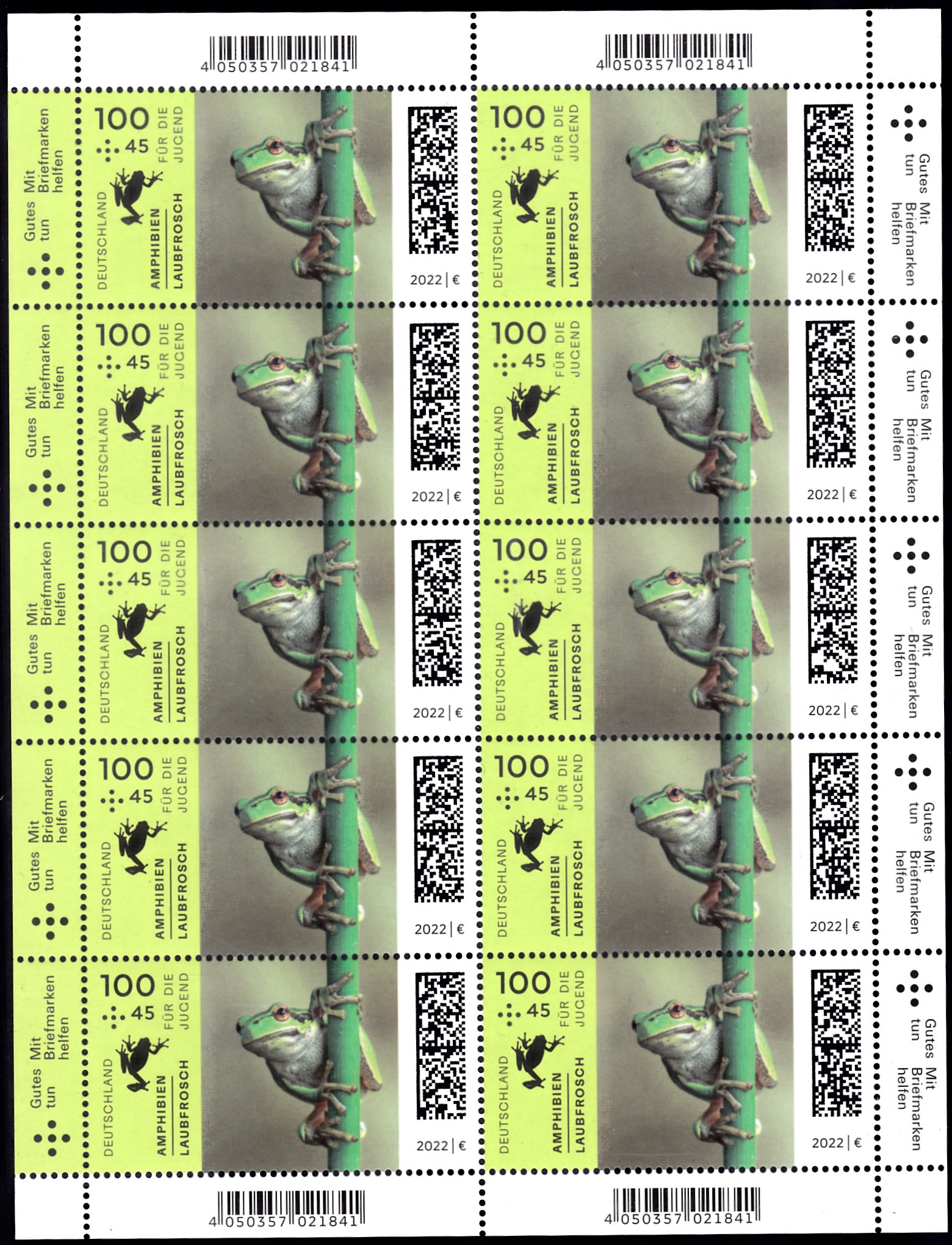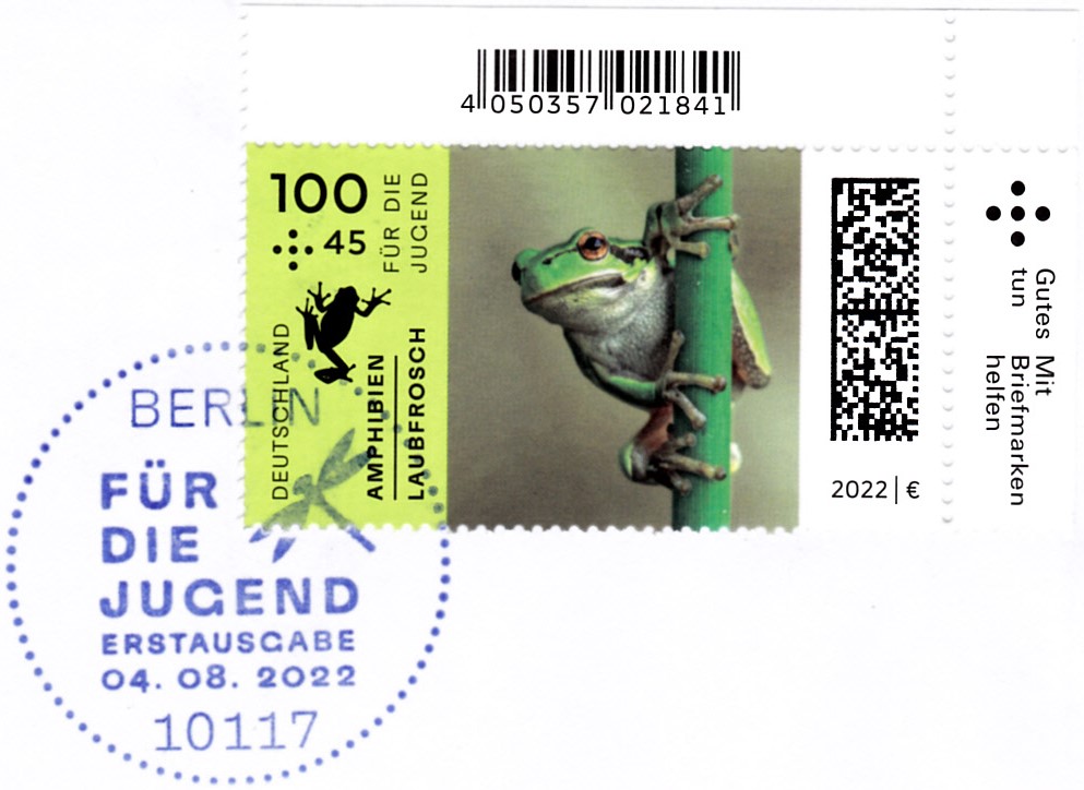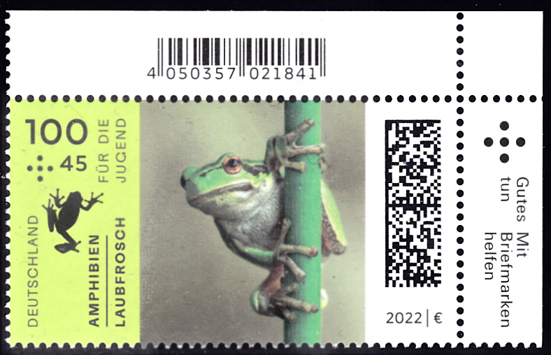 Auf einer Jugendmarke 2022 der Deutschen Post (MiNr 3707) ist ein Europäischer Laubfrosch (Hyla arborea) abgebildet. Hier zeige ich eine Marke vom Eckrand mit EAN-Codierung.
