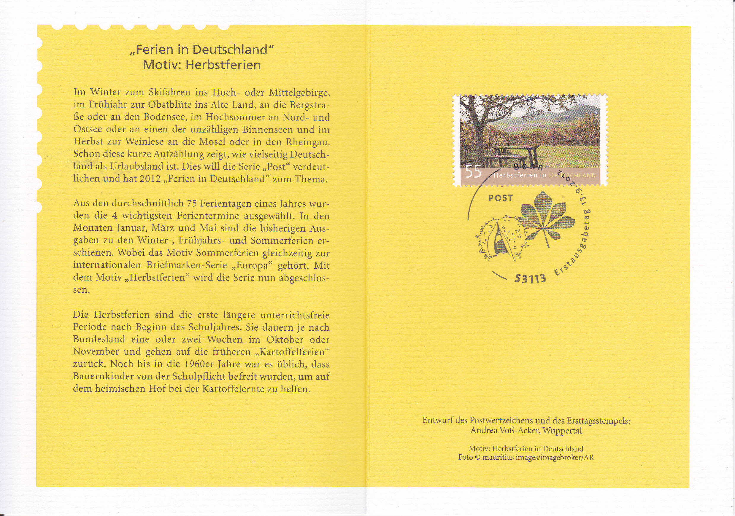 Klappkarte des Vorstandsvorsitzenden der Deutschen Post AG mit einer Marke (MiNr 2953) mit dem Motiv "Herbstferien" aus der Serie "Post: Ferien in Deutschland" und dem Ersttagsonderstempel Bonn.
